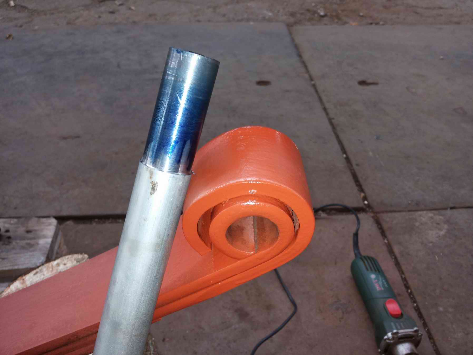 Wie soll man da eine vernünftige Passung herstellen ? Ich mußte daher das Federauge erstmal rund bekommen. Ich habe das mit Messen und einem abgedrehten Rohr mit Tuschierpaste erreicht. Immer da, wo die Paste übertragen wurde, habe ich etwas weggeschliffen. Dann ein neues Stück Rohr nochmal 0,08 mm größer gelassen und wieder angepaßt. Nach 10 Minuten war das Loch halbwegs rund.