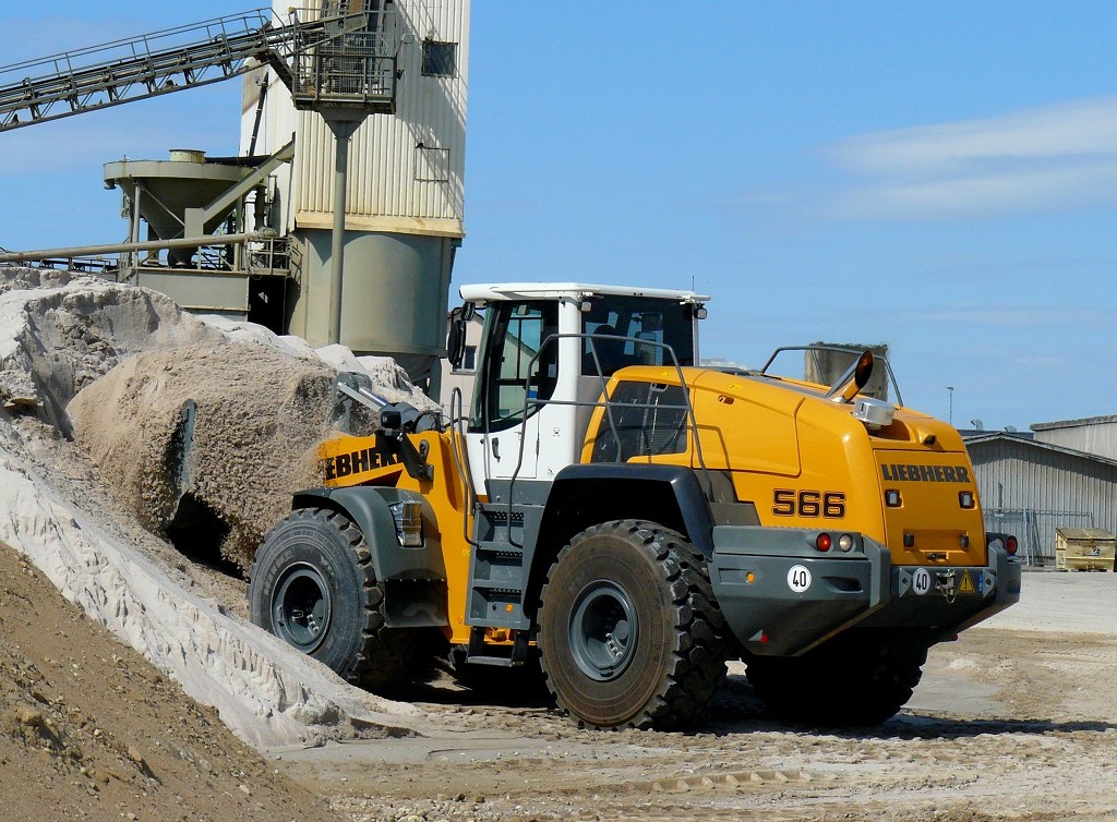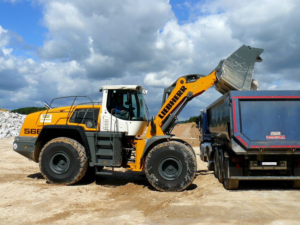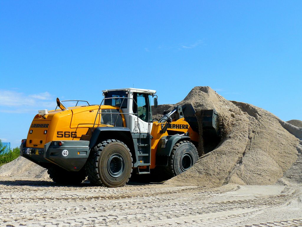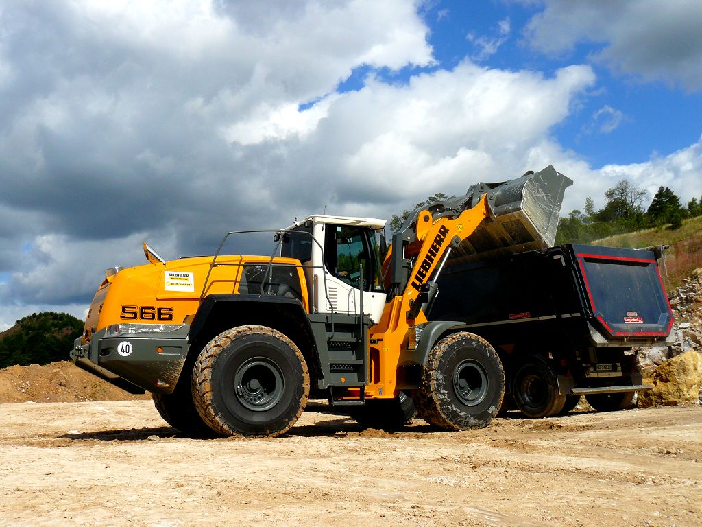 Der L566 arbeitet in einem Kieswerk und hat die Aufgaben den Kies an der Wand abzubauen und in einen Trichter zu kippen, Material zu mischen und LKW´s zu beladen.