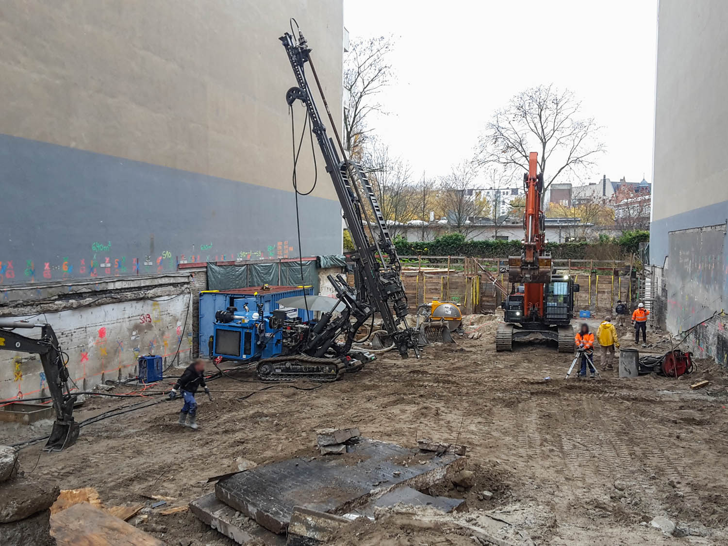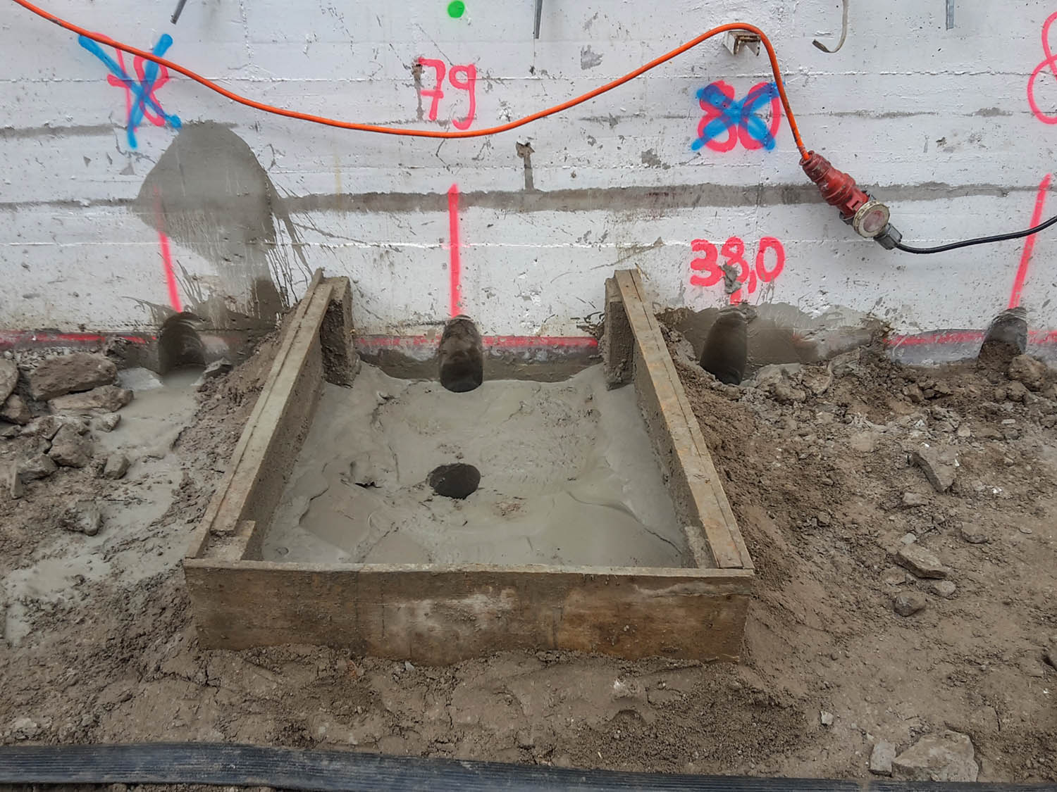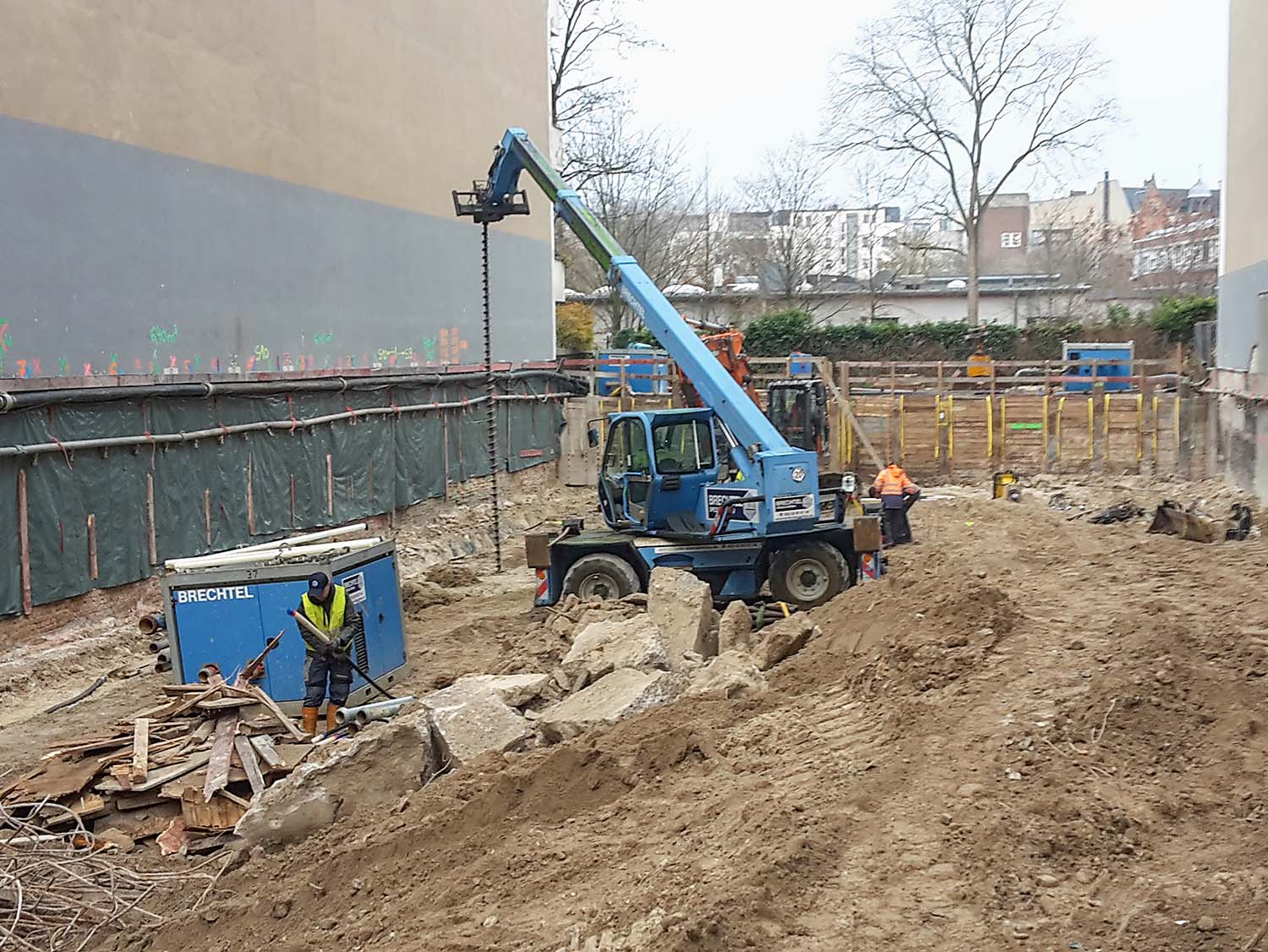 Dort sieht man auch den Aufbau der blauen Wasserrohre für das Grundwasser-Management.