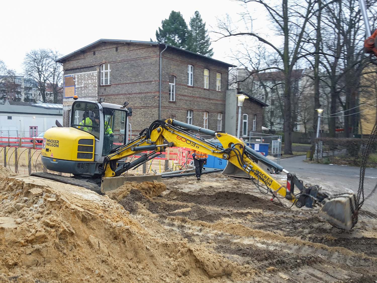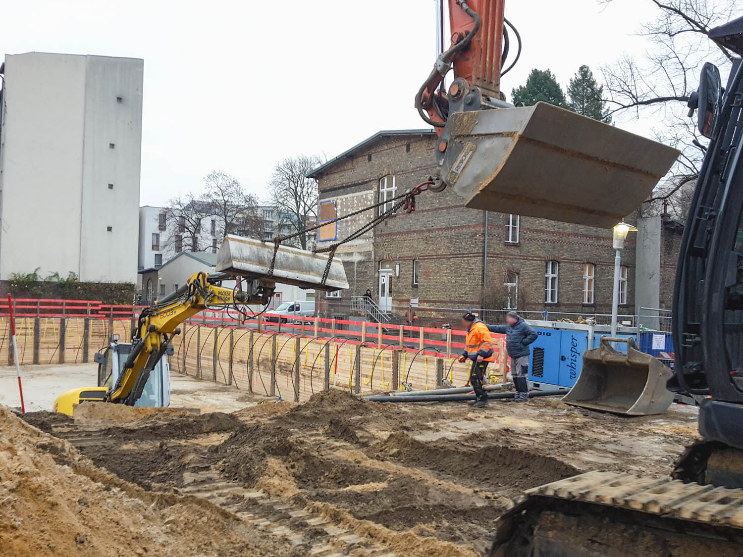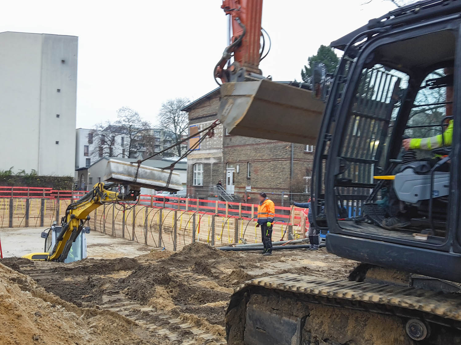 Dafür fehlt dem Bagger aber eine Hydraulikleitung für den Rücklauf, also muss er ausgetauscht werden gegen den, der gerade in Treptow einen Bombentrichter freilegt für eine Schulerweiterung.