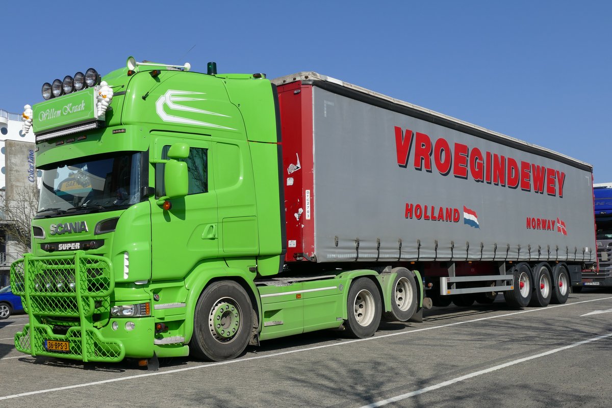 "Willem Kraak" unterwegs für "Vrorgindewey" mit einem Scania R 520, mit einer etwas anderen Art das Essen warm zu machen. großes Grinsen