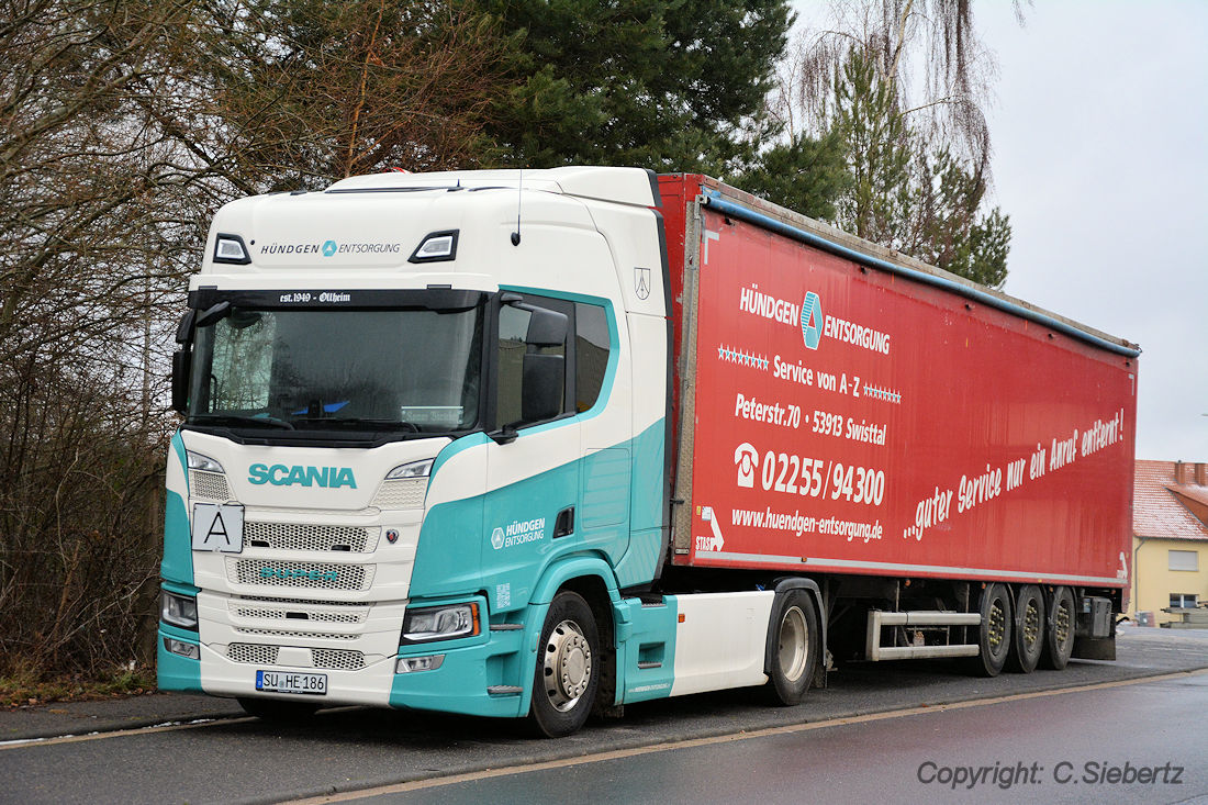 hier ein Scania NG mit unbekannter Motorisierung und Stas Walking-Floor Auflieger vom 1949 gegründeten Entsorgungsunternehmen Hündgen aus Swisttal-Ollheim.