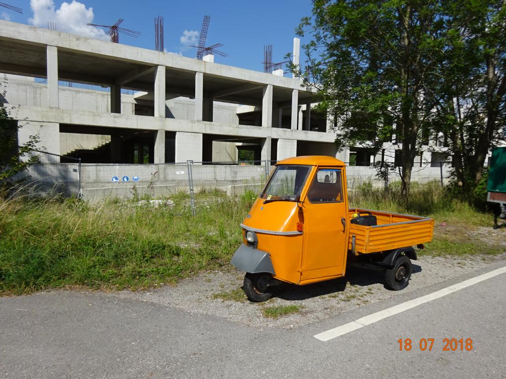 Ape in ihrem artgerechten Einsatzgebiet unter südlicher Sonne? Naja, nicht ganz. In München fast vor meiner Haustür. Immerhin, der Hintergrund hat was mediterranes: diese Bauruine hätte mal eine griechische Schule werden sollen.