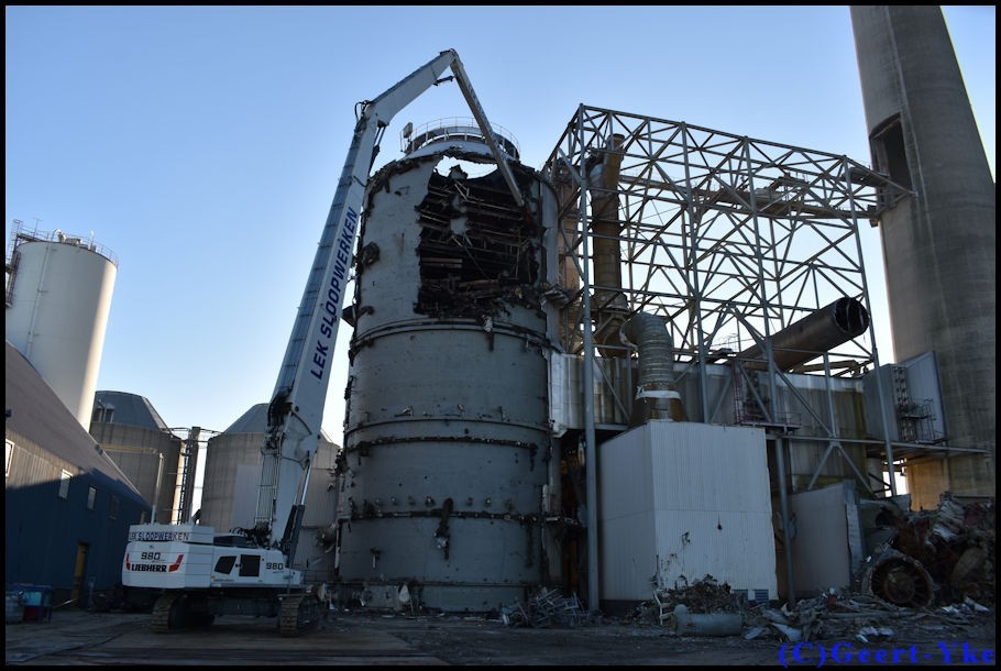 Abbruch von ein Industriegebaude mit 50m. hohe gebaude und silo's mit der R980 Demolition Longfrontbagger von Lek Sloopwerken. Im einsatz mit 55m. Beco Abbruchausleger und NPK SV-250R Abbruchzange.