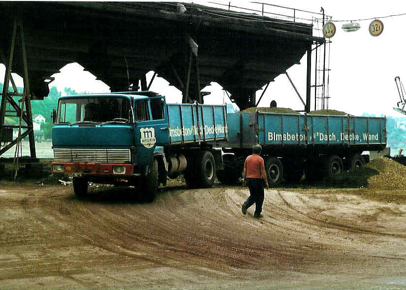 Weil die LKWs aus der Eifel so schön sind, hier noch ein Meurin: Magirus 310 D 16 FK beim Abkippen wieder im Andernacher Rheinhafen. Und ein seltener Mercedes-Benz LAPK 2632 im Andernacher Hafengelände.