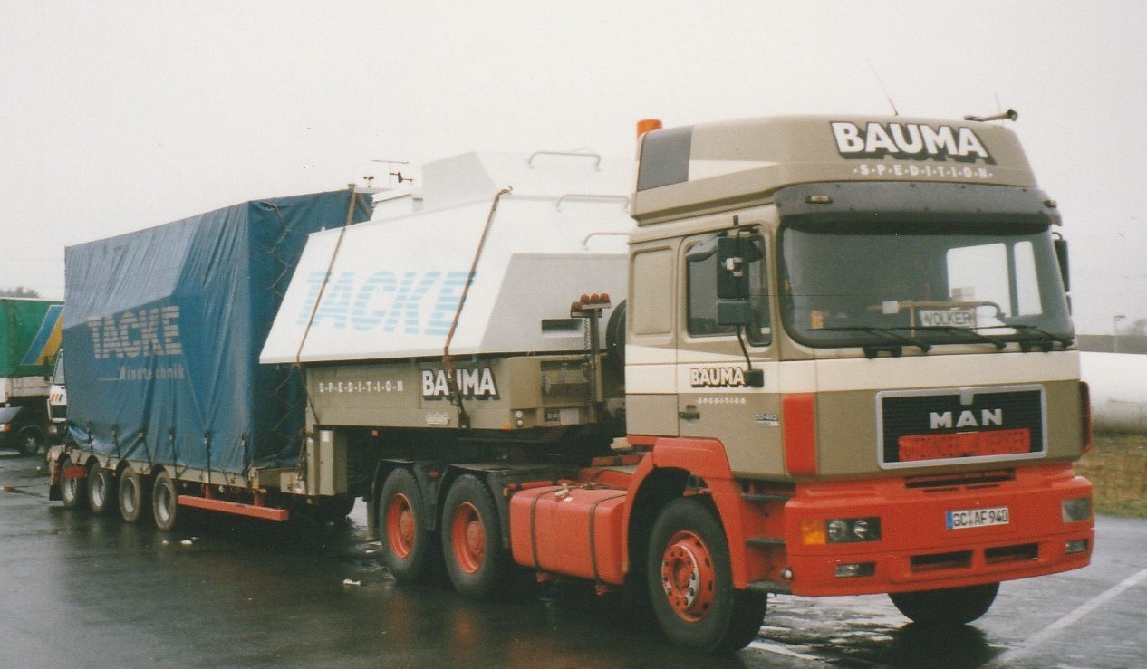 MAN F 2000 mit 4 Achs Sattelauflieger, beladen mit Bauteilen der Windtechnik - Firma TACKE.