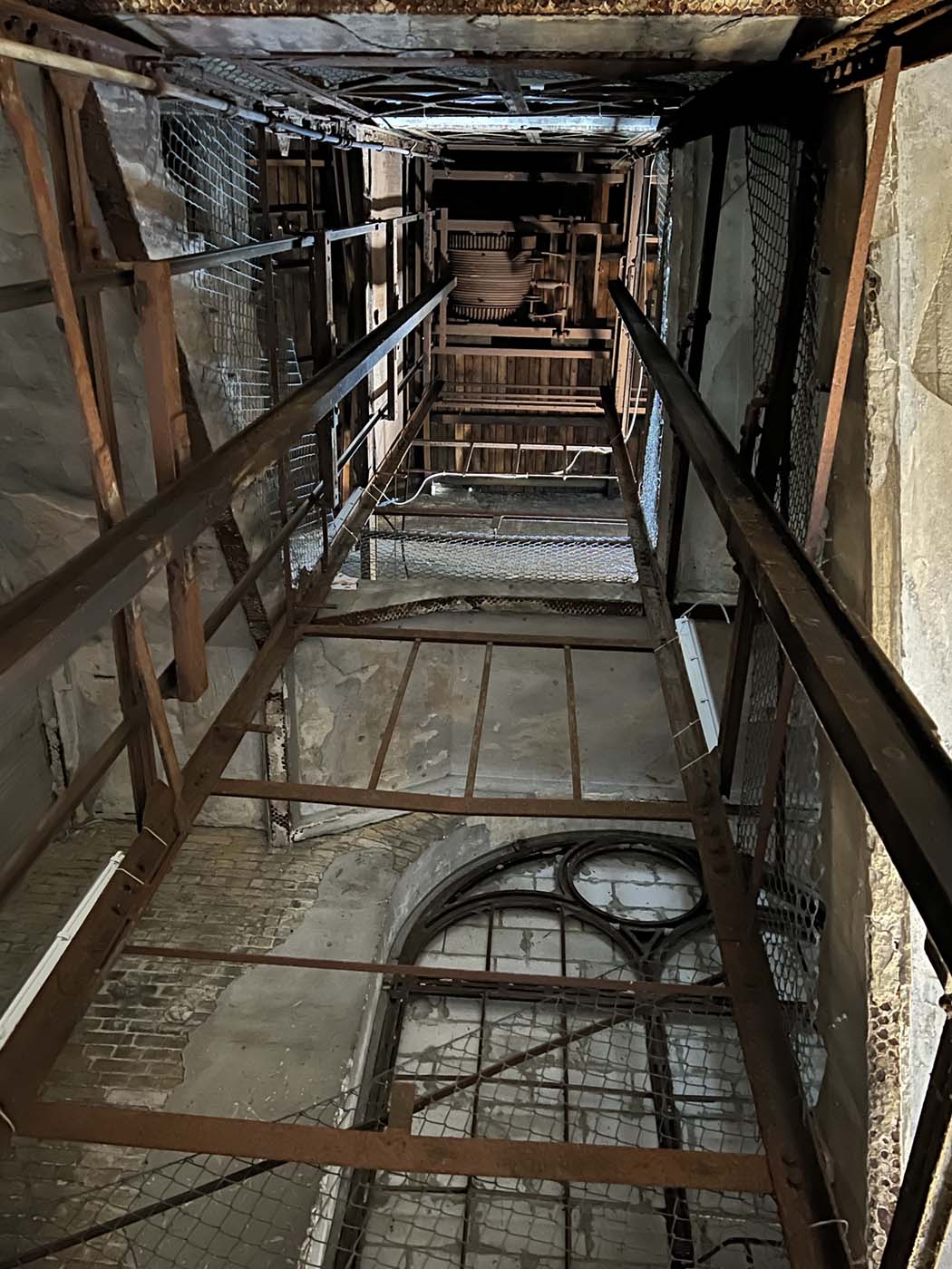 Foto 8 zeigt den Blick in den Fahrstuhlschacht von unten nach oben.