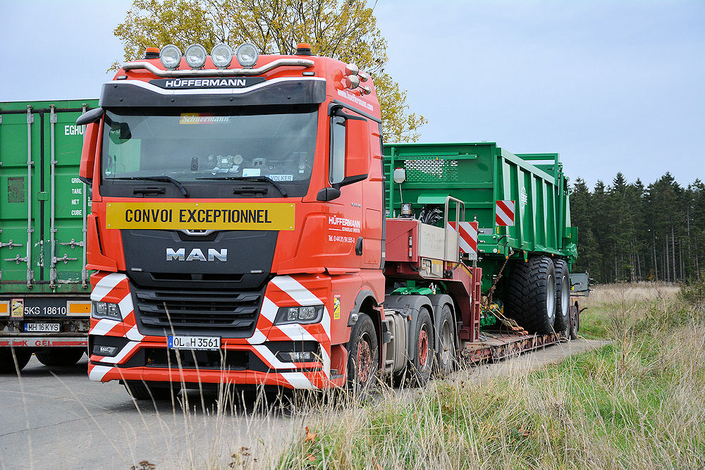 Nun aber noch ein Foto aus dem Bereich Schwertransport in Form dieses aktuellen MAN TGX 26.540 6x2, den man hier beim Transport eines Tebbe Streuers sieht.