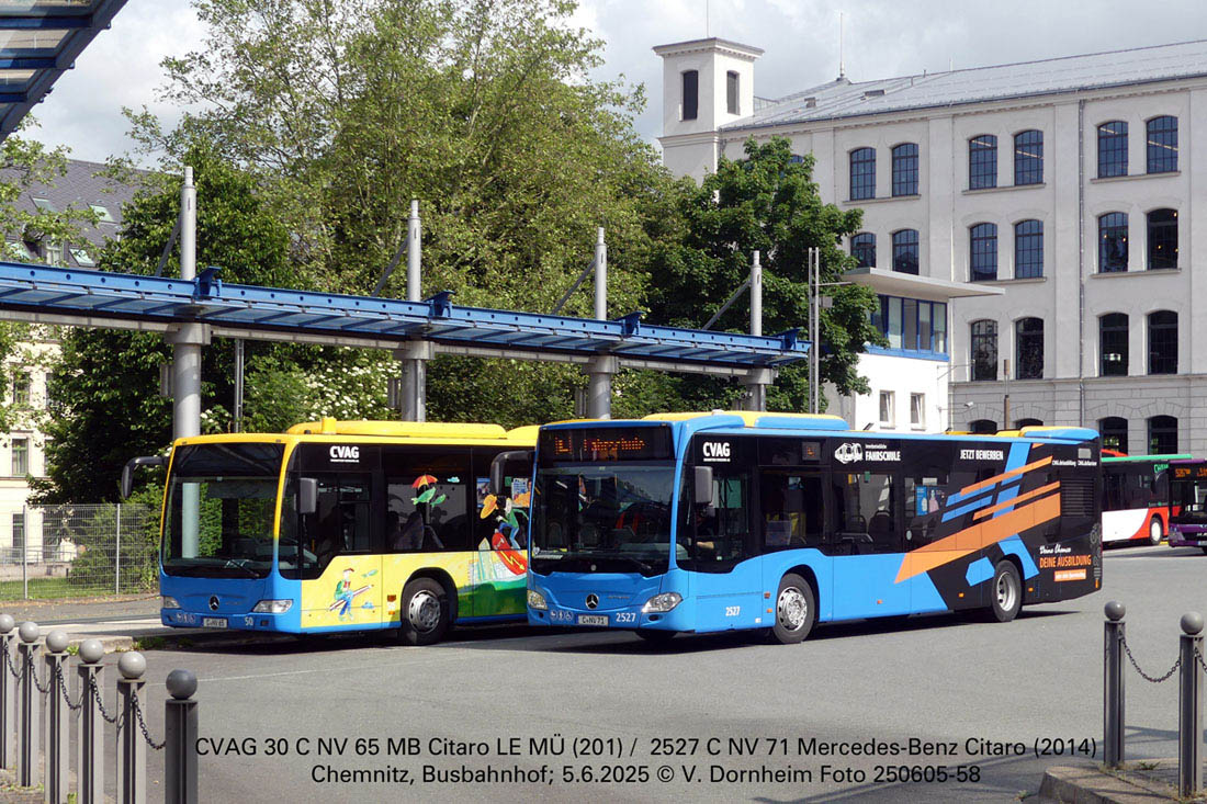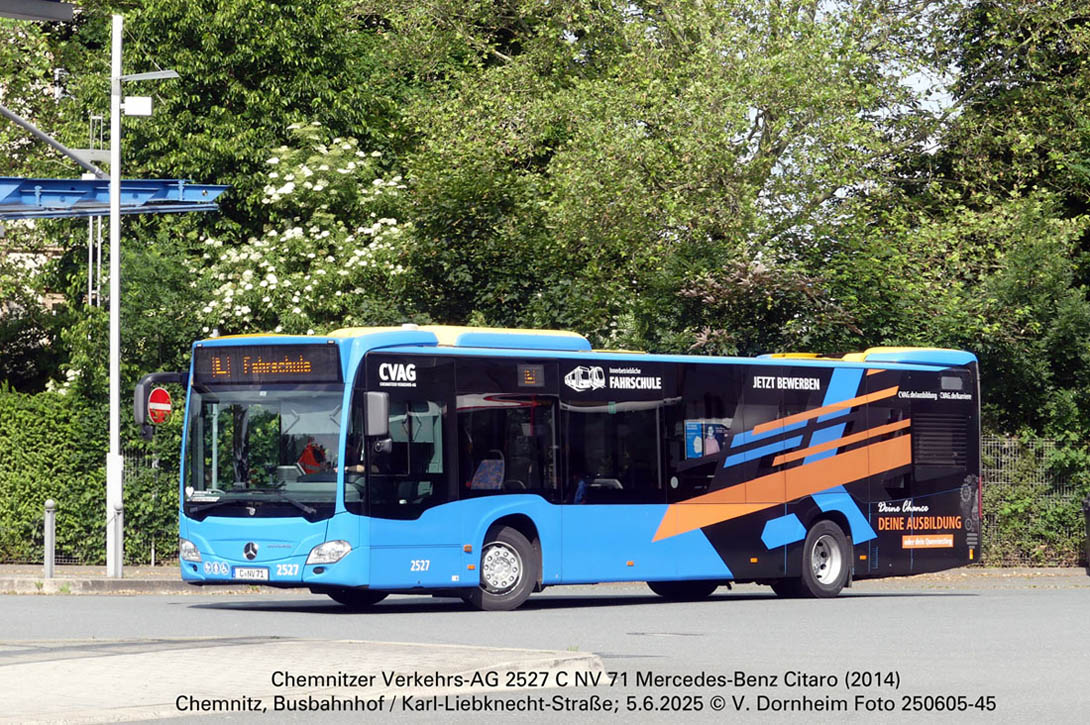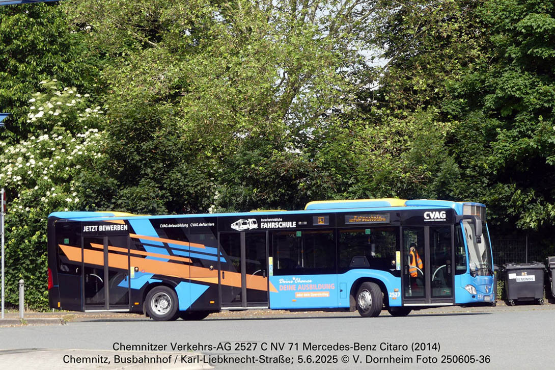 Chemnitzer Verkehrs-AG 2527 C NV 71 Mercedes-Benz Citaro (Baujahr 2014) am 5.6.2025 im Busbahnhof Chemnitz.