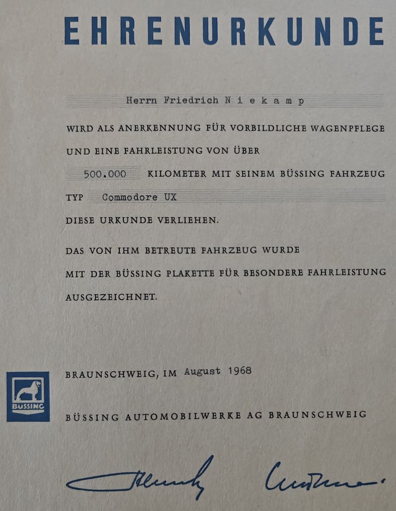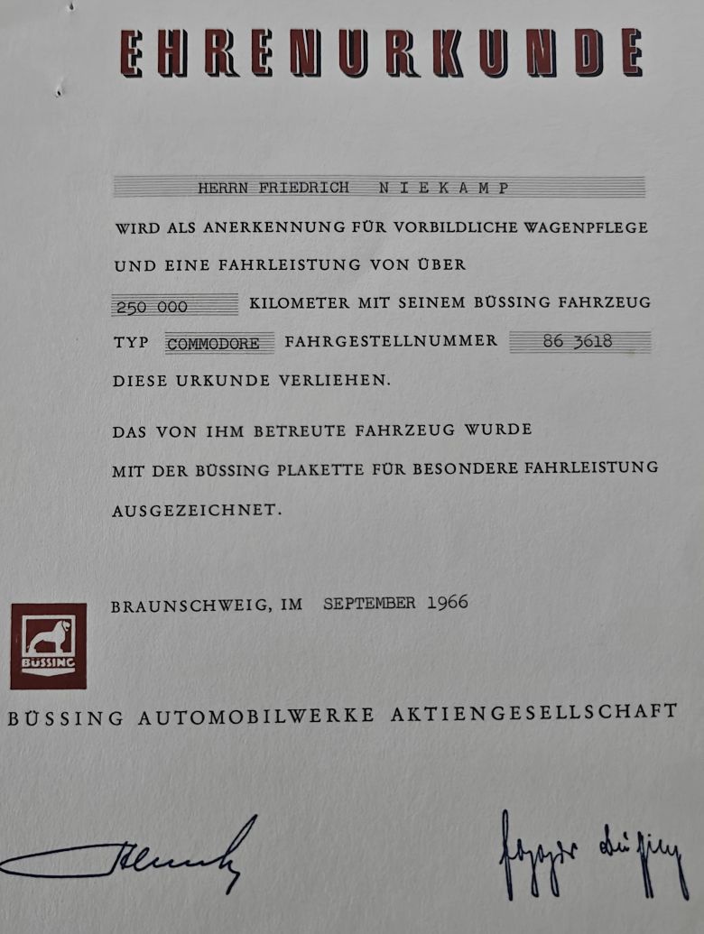 Ich habe hier noch zwei Ehrenurkunden für 250.000 km und 500.000km aus den 60er Jahren !!
