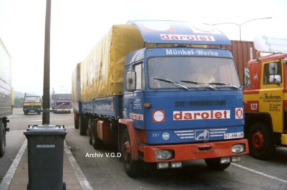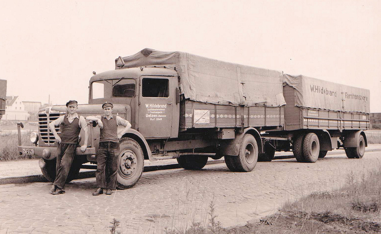 ein stolzes Fahrerduo vor ihrem 105er Büssing Hängerzug des Ferntransportunternehmen W. Hildebrand aus Uelzen.