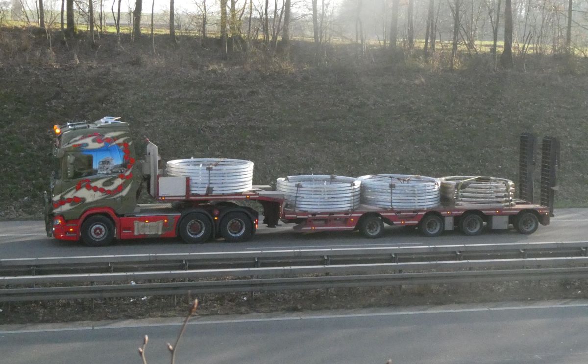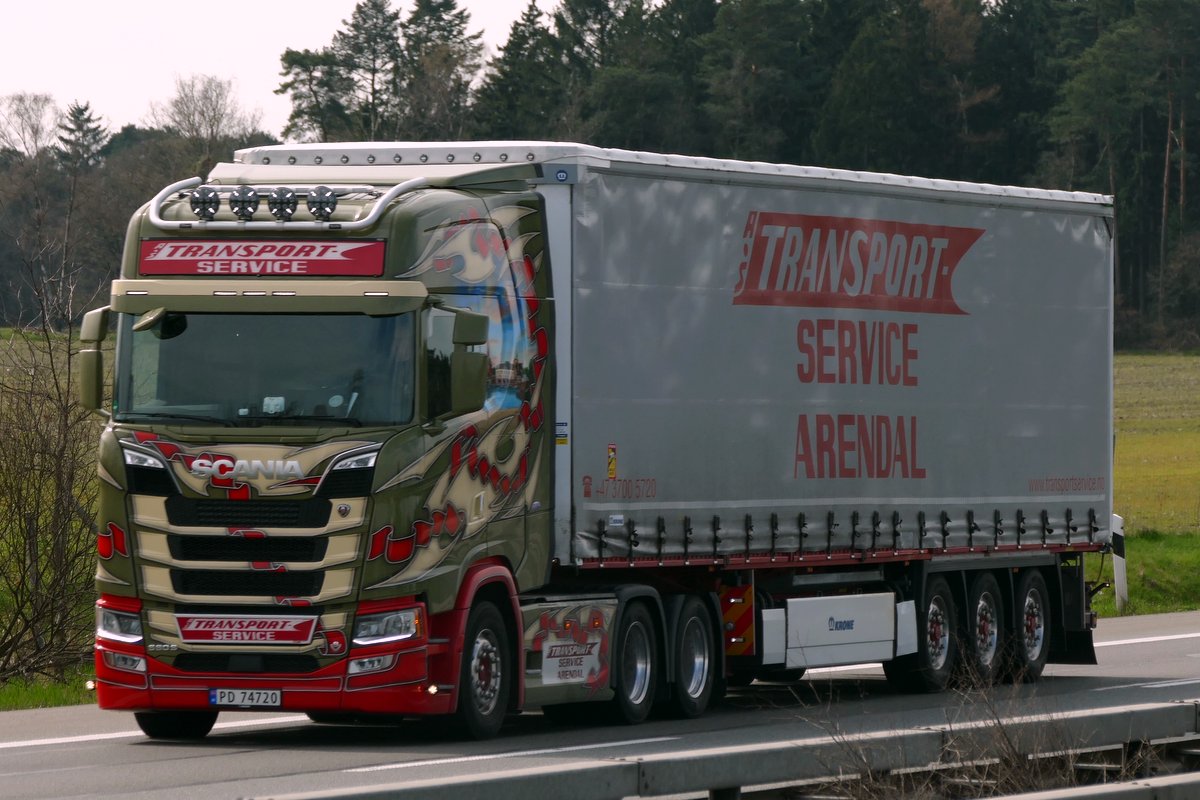 ungewöhnlich gestalteter Scania 660S von "Transport Service Arendal" unterwegs auf der A1