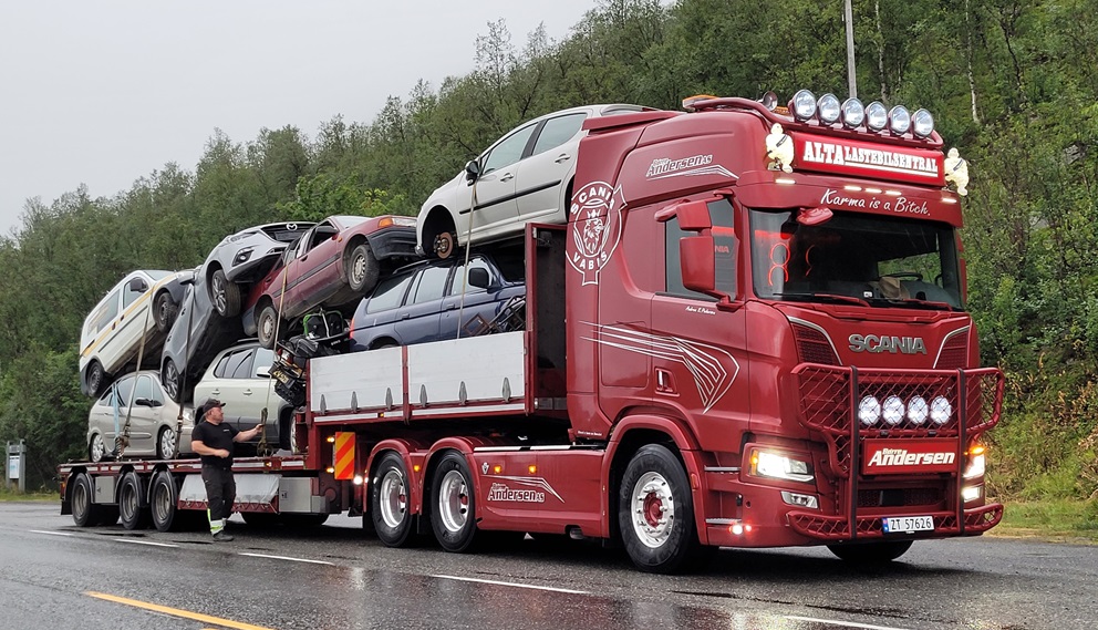 In der nähe von Alta im Norden von Norwegen hatte ich diese nette Begegnung. Als dieser schöne Scania R660 von Børre Andersen As auf dem Parkplatz stoppte um die Ladungssicherung zu kontrollieren, fragte ich ob ich ein Bild machen dürfte. Prompt wurde ich eingeladen auch mal die Kabine von Innen zu bestaunen, inklusive Klang & Licht Show der Musikanlage. Dafür daumen an den Fahrer.