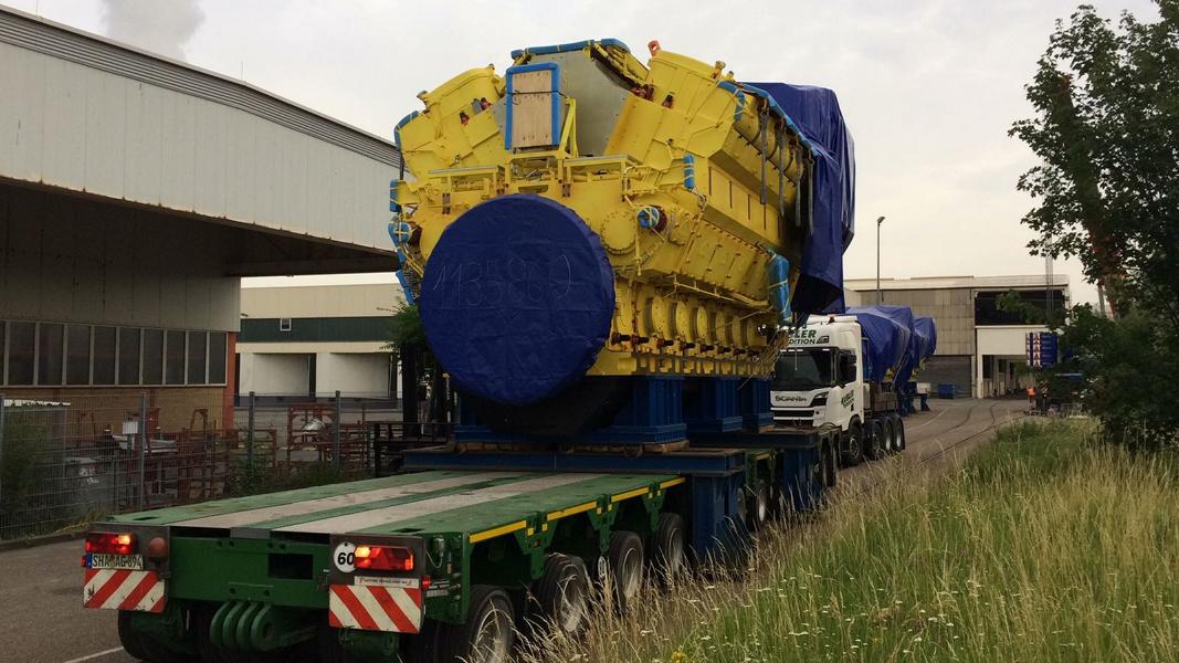 Wie sich doch die Zeiten ändern...als ich vor ein paar Jahren die Verladeszenerien miterlebt habe (extra einen Tag dafür frei genommen), waren es noch Krane von Wiesbauer und Voss hat die Motoren mit einem selbstangetriebenen THP Roller von der Montagehalle zum Umschlagplatz gefahren.