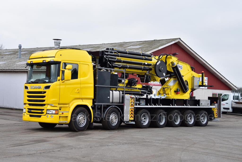 Scania R730 14x4*10 mit MPG Kran. Der Kran hebt bei 30m Auslage ca. 7,5 Tonnen.