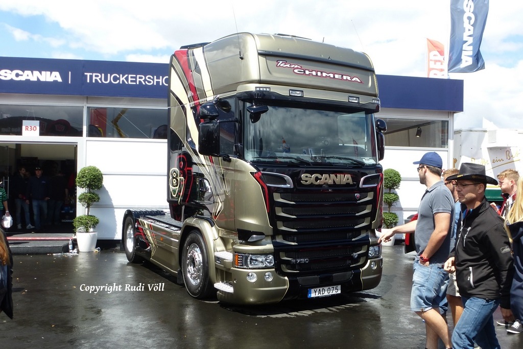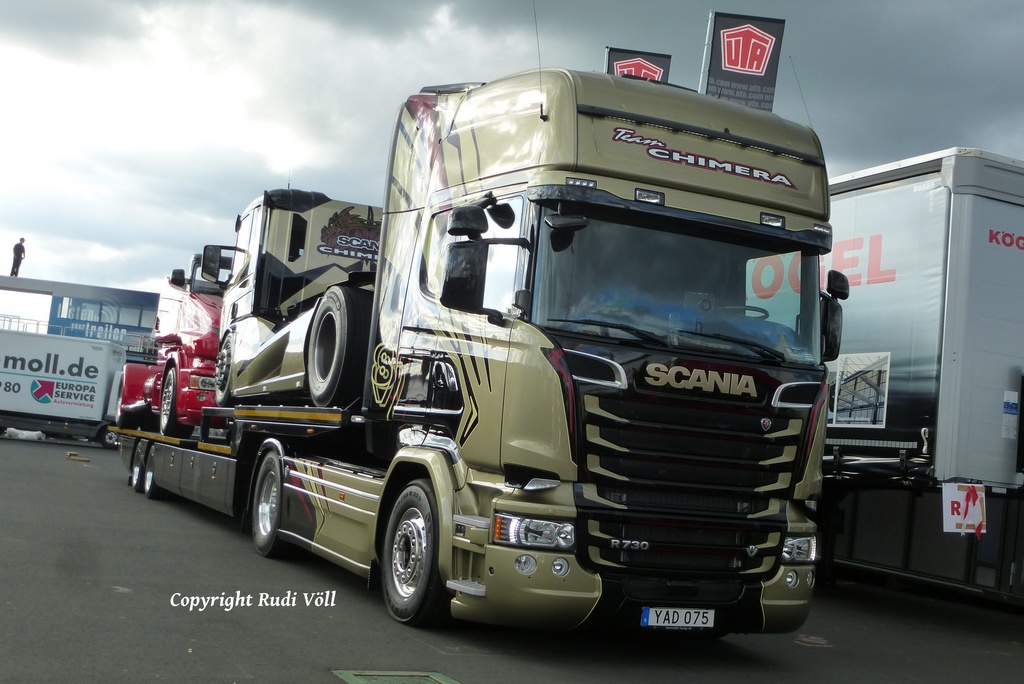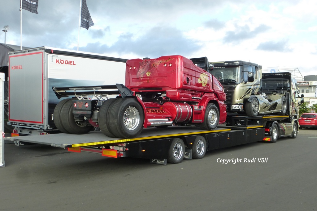 am Scania-Stand beim Truck Grand Prix am Nürburgring konnte man auch diese R730Topline Sattelzugmaschine von Svempas sehen. Sie gehört dem Team Chimera von Svempas. Was "Chimera" ist, kann man hier sehen, vom Hauben-Roadster "Red Pearl", der hinen aufgeladen ist, findet man dort ein paar Bilder winke