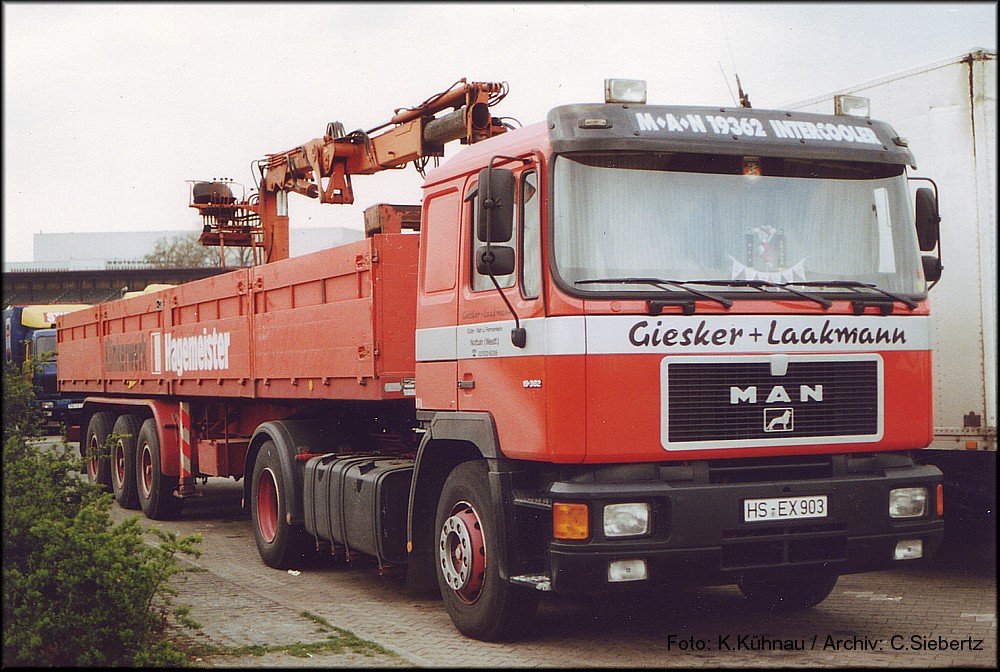 Ich glaube dadurch kann ich jetzt diesen 19.502 ebenfalls der Spedition Schomaker zuordnen. Auch wenn er hier einen Planensattel zieht, war auch dieser F90 in der Regel für Schmidt im Siloeinsatz unterwegs.