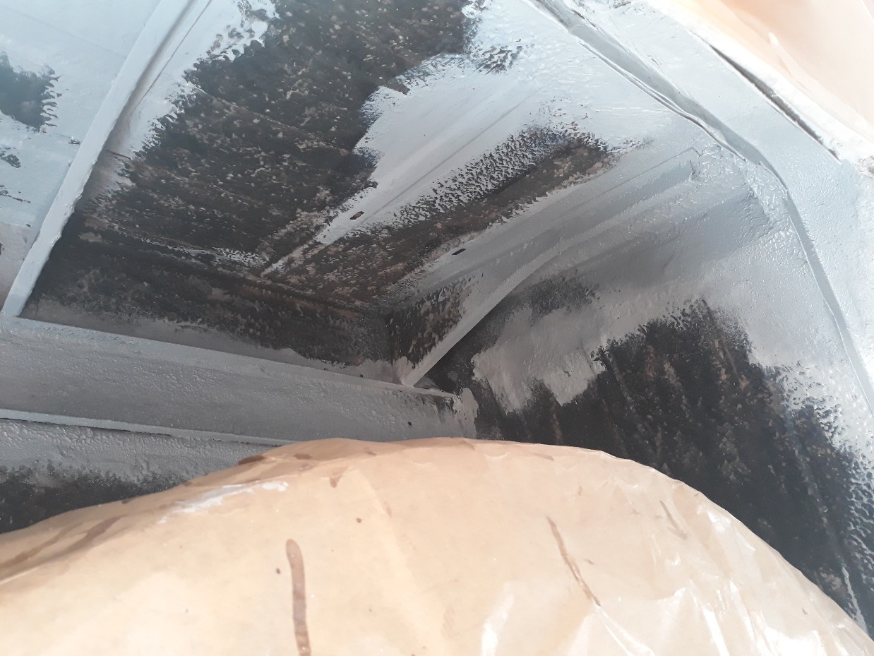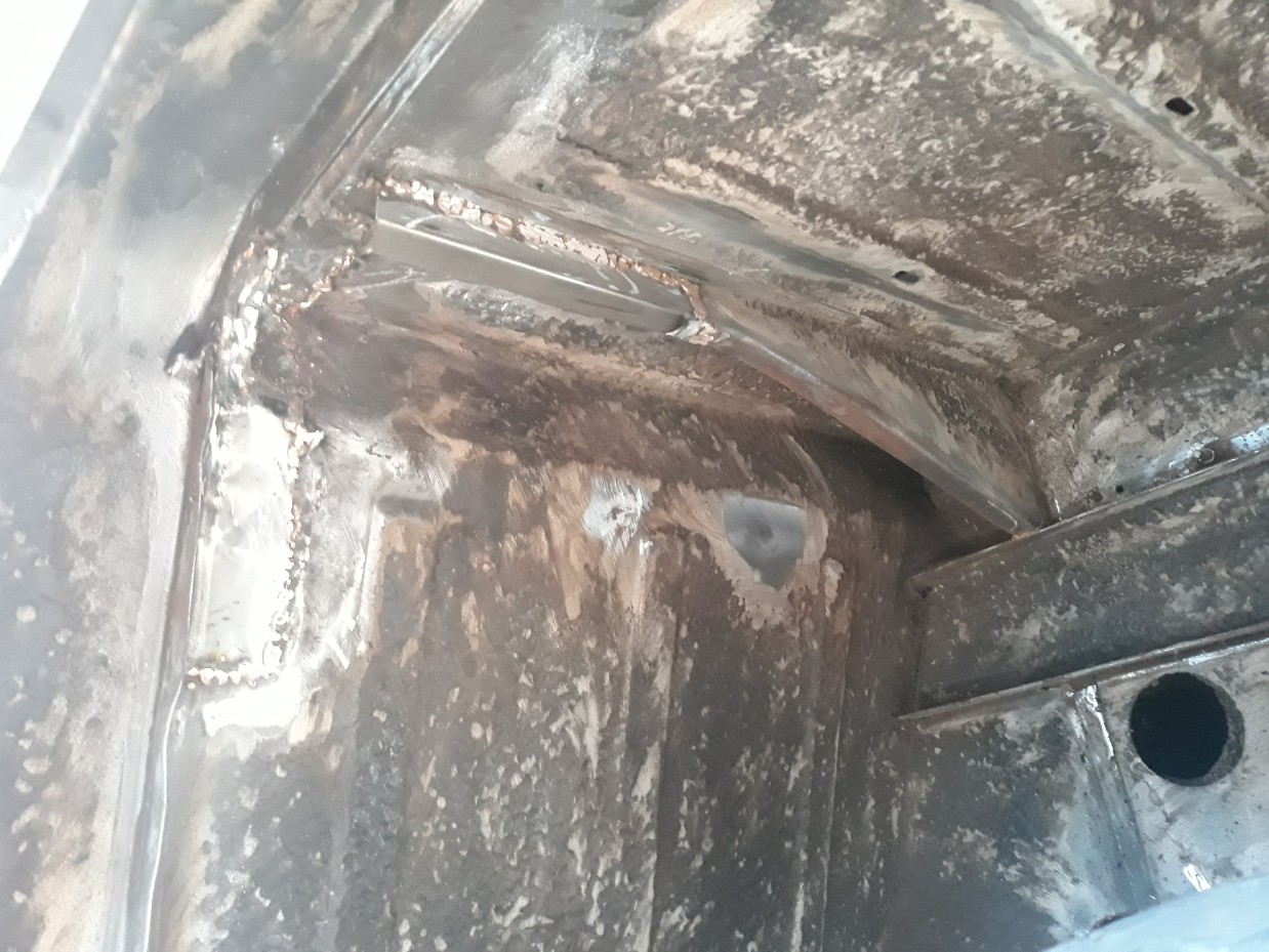 Viel mehr Arbeit als gedacht, auch waren sehr viele Stellen zu schweißen. Offensichtlich wurde damals bei der Restaurierung nicht 100%ig gearbeitet, er hat mir viele dicke Klumpen aus schwarzer Dichtmasse gezeigt.