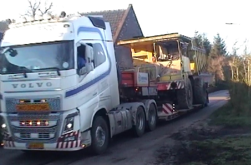 Hier geht die Geschichte weiter : Beim dritte Besuch habe ich den Löffel und Stiel von den O&K RH14 demontiert und versucht um den lehre Vorderreifen von Faun nummer eins wieder auf Druck zu bringen, das hat aber nicht geklappt : die 3 teilige Felge mit rubber O-Ring Abdichtung hat kein Luftdruck mehr behalten . Dann habe ich entschlossen um nicht mehr Arbeit an die Reifen zu spendieren und um das Fahrzeug eventuel mit Hilfe von ein Radlader zu verladen . Auf das erste Bild ist zu sehen das die Muldenkipper und der O&K Bagger nochmal die Erweiterung von die Hofmair Kiesgrube weichen mussten . Das Transport ist gemacht worden mit einen fast neuen Volvo FH16 6x4 750PS Zugmaschine mit Tieflader von die Firma Bierings Schwerlast Spedition aus Holland .
