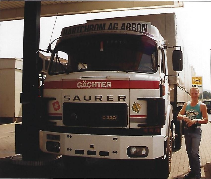 Hallo zusammen ich erlaube mir zu vermelden dass es sich bei diesen DREIER SAURER um 3 Baugleiche Fahrzeuge handelte Fz. 44 / 46 / 47 wurden im gleichen Jahr ausgeliefert , Wobei der 46er eine Kupplungseinrichtung hatte um den Transmaxim von Kässbohrer zu ziehen . Auch wurden die 3 Achser Hänger ziemlich frei getauscht . Mei dem einen Bild ist ein Lanz&Marti Anhänger zu sehen das andere Bild ist ein Kässbohrer mit grösseren Rädern. Ich fuhr zu dieser Zeit auch die Nr.38 mit einem Jumboanhänger unter Anderem im Marokko-Verkehr