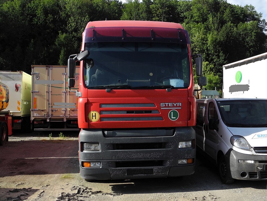 Steyr STA 18S31, der aktuell bei einem Nfz-Händler im Salzburgischen steht (die "Farbklecksereien" stammen von mir, da er mich um die Neutralisierung von Firmenaufschriften im Falle von Veröffentlichung gebeten hat - was selbstverständlich zu respektieren ist):