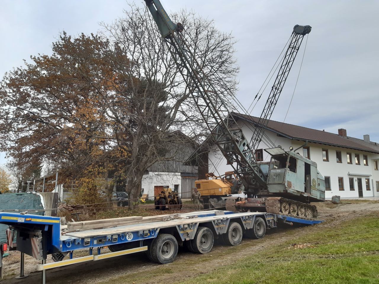 Aufladen eines Menck M 90 mit defektem Fahrwerksantrieb. Habe das Schürfkübelseil (Grabseil) dazu benützt den Bagger auf den Tieflader zu ziehen. Dafür habe ich es zweimal umgelenkt. Eine Klapprolle am Tieflader und dann eine am Bagger befestigt, das lose Ende dann zurück zur Kröpfung des Tiefladers. Dann mit der Schliesswinde angezogen. Der Bagger ist ganz ruhig genau dahin gelaufen wo er sollte. Der Ladevorgang selber hat nicht länger gedauert als normal. Die Vorbereitung natürlich schon. Alles bestens gelaufen.