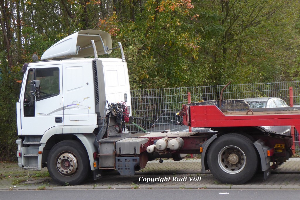 weiter oben hatte ich die Zugmaschine schon mal mit Pritschenauflieger gezeigt, hier nun ist die Eurotech440ET38 mit Tiefladeauflieger zu sehen, wie ich sie im Oktober 2020 in Düren gesehen habe.