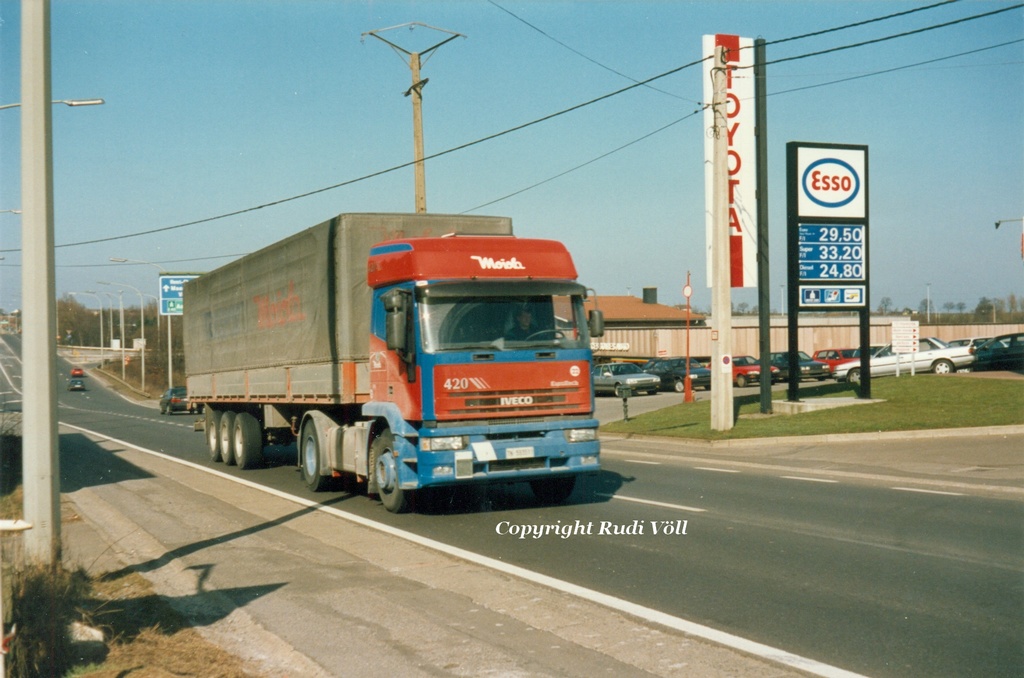 Im März 1993 habe ich diesn 440ET42 Pritschensattelzug von Moiola im Belgischen Eupen fotografiert, damals einer der ersten dieses Typs, den ich gesehen habe.