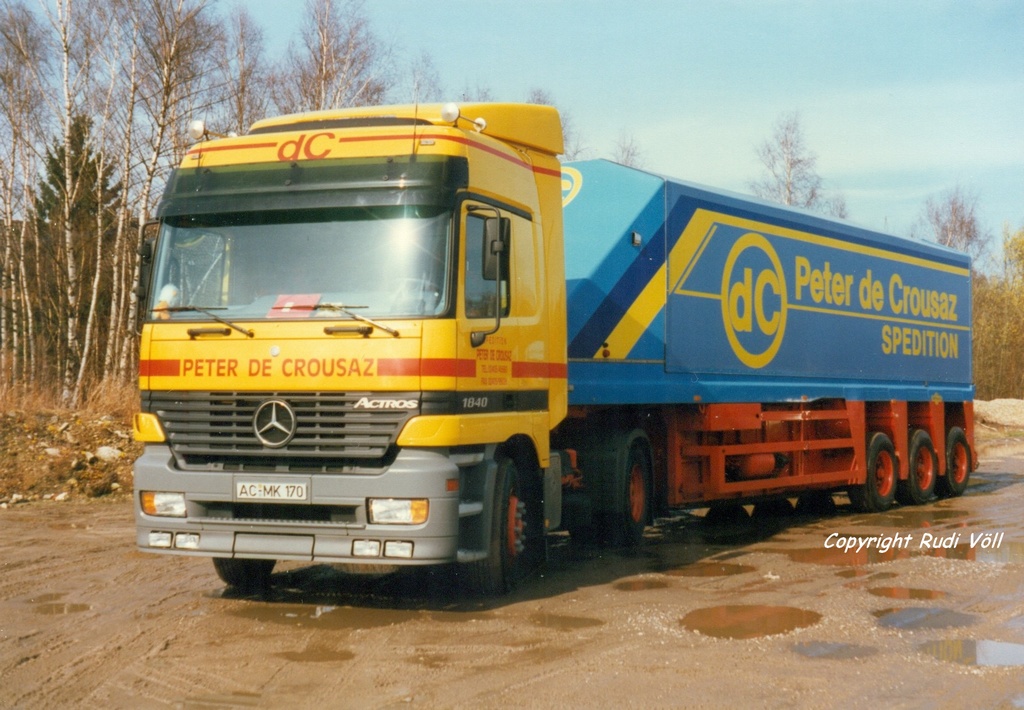 Peter de Crousaz hatte seinen Firmensitz mitten in Würselen in einem Wohngebiet. Vermute mal, daß da bei Firmengründung noch keine Wohnhäuser waren. Kann mich auch noch gut erinnern, daß jeden Sonntagabend so gegen halb zehn ein gelber Lindwurm von de Crousaz-Lastern vom Firmengelände durch Würselen zur Autobahnauffahrt Verlautenheide am Autobahnkreuz Aachen zog. Das waren dann locker mal so an die 30 Laster, wohl alle, die nicht erst am Montagmorgen los mussten. Denke, daß man mit der Nachbarschaft ein Genleman-Agreement geschlossen hatte, daß die Laster alle hintereinander die sonntagabendliche Ruhe störten, anstatt daß alle 10 Minuten und die halbe Nacht durch einer startete. Heute ist auf dem ehemaligen Gelände Wohnbebauung und wenn man es nicht weiß, würde man nie vermuten, daß dort mal sicher 40-50 Laster stationiert waren.
