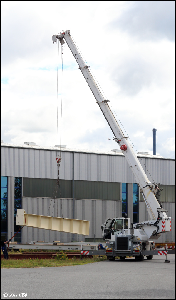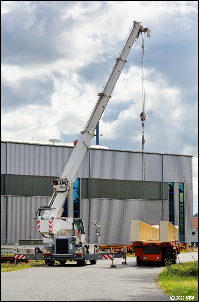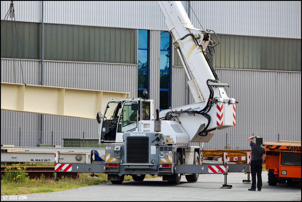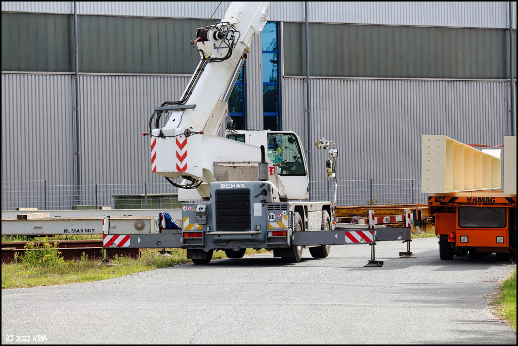 Ein Demag AC 25 Mobilkran entlädt Stahlbauteile von einem Kamag Industrietransporter.