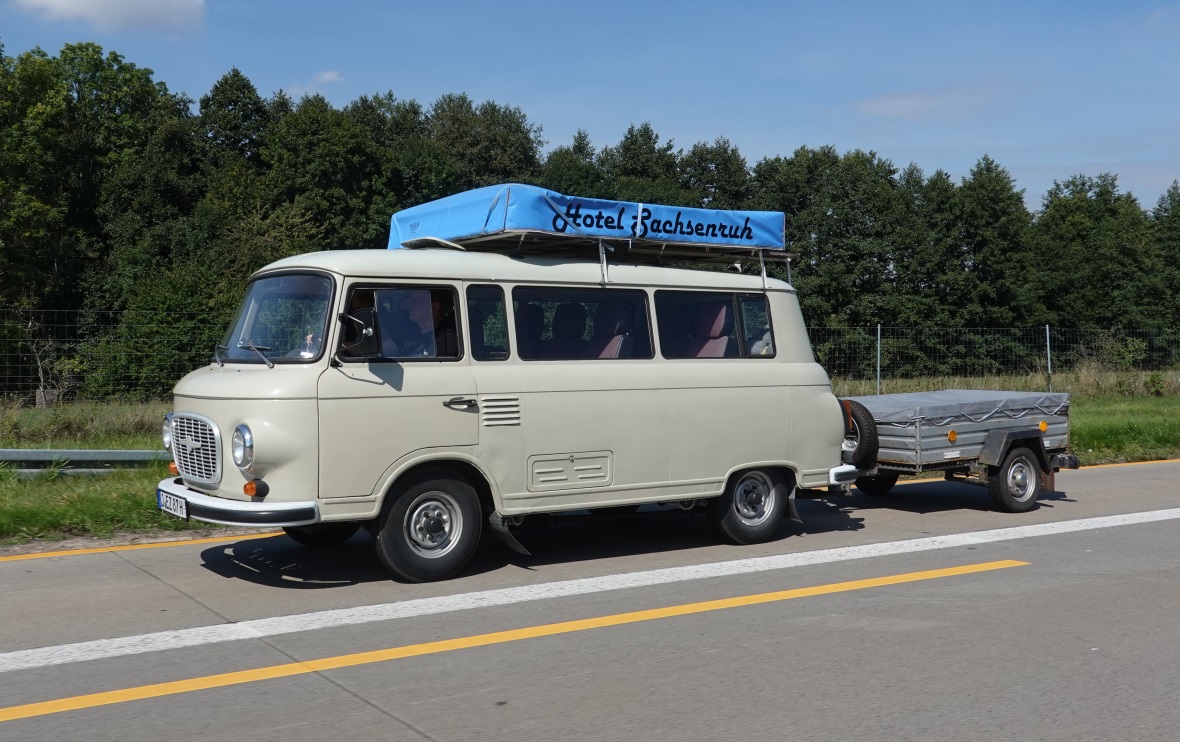 Noch ein Bild vom Sonntag: Auf der A4 war dieser B1000 mit Müller-Dachzelt "Hotel (eigentlich Pension) Sachsenruh" unterwegs. Ob der Anhänger auch aus DDR-Produktion stammt ist nicht ganz eindeutig, auch wenn er die 13 Zoll-Felgen vom Trabant drauf hat. Auf der Gegenfahrbahn sichtete ich ebenfalls einen B1000 mit Qek Junior hinten dran. |