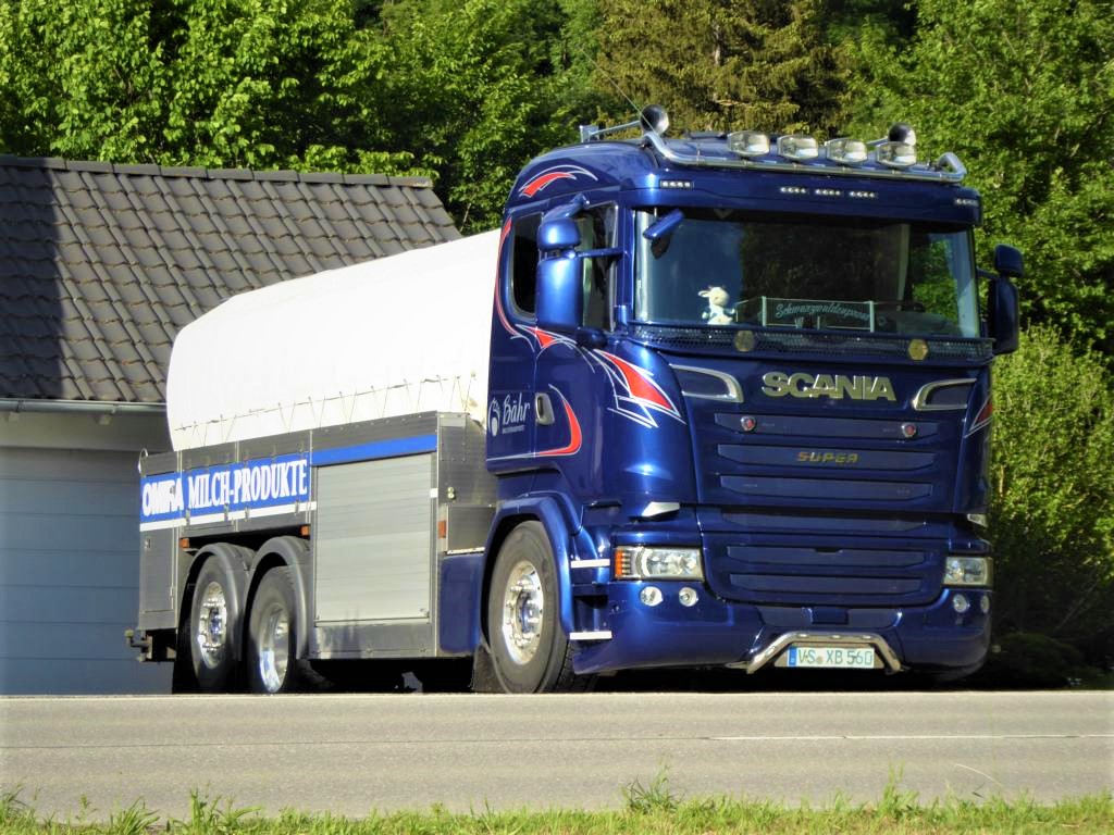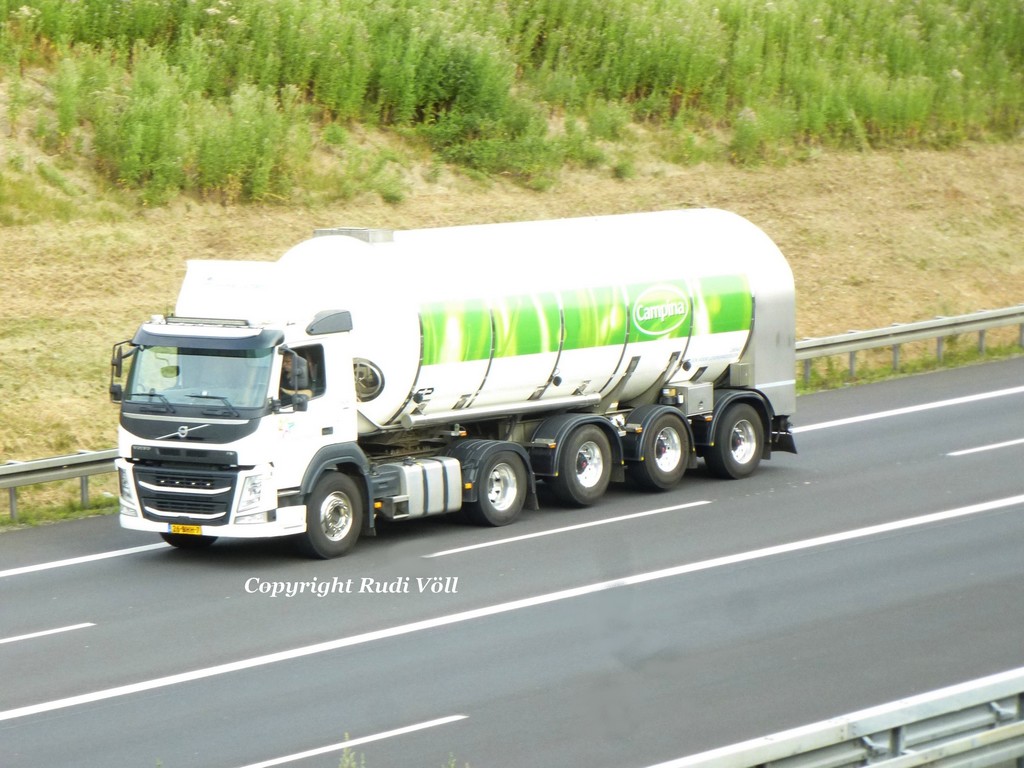 diesen sehr kompakten Volvo FM500 Milchsammelsattelzug von Campina habe ich im Juli 2018 am Autobahnkreuz Aachen aufgenommen. Wenn man genau hinschaut, sieht man, daß die erste und dritte Aufliegerachse lenkbar sind, wodurch auch kleine Bauernhöfe problemlos angesteuert werden können.