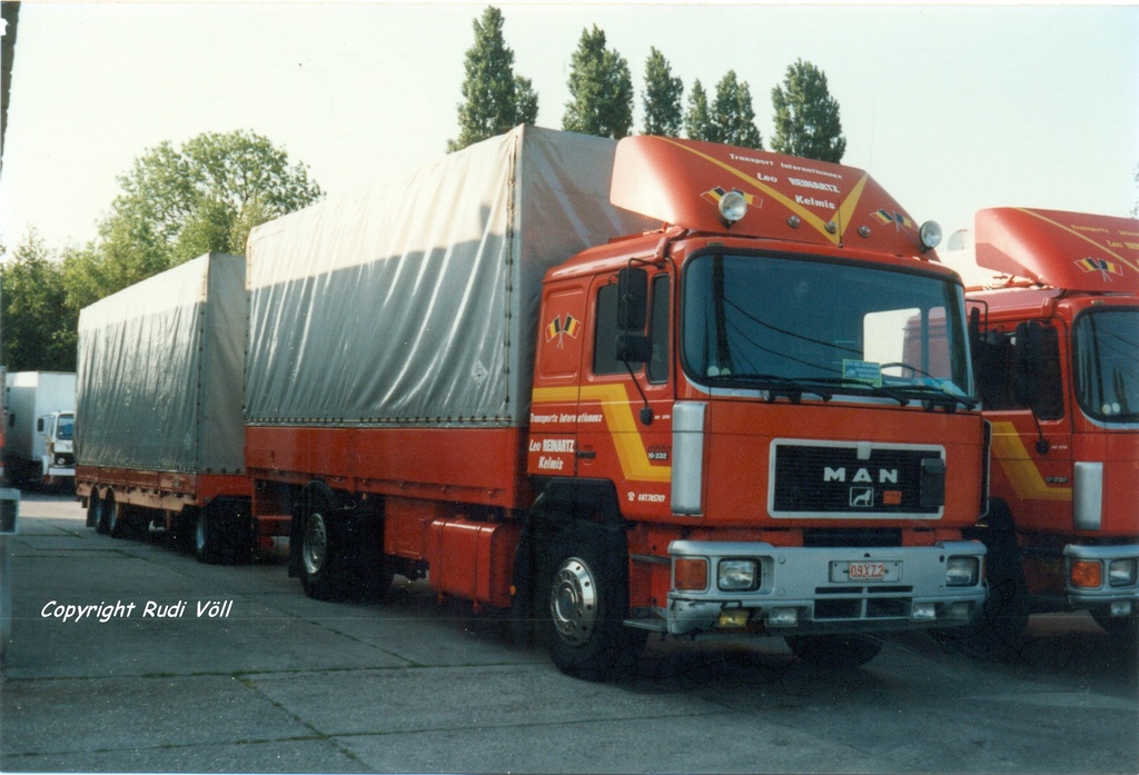 Tja, was den Anhänger angeht, das dürfte auf jeden Fall ein Belgisches Fabrikat sein. Solche Außenrahmen sah man viel bei Jumbo-Anhängern, wo ja der Rahmen über dem Drehschemel sehr flach ausfallen musste. Übrigens auch bei Tiefladern.
