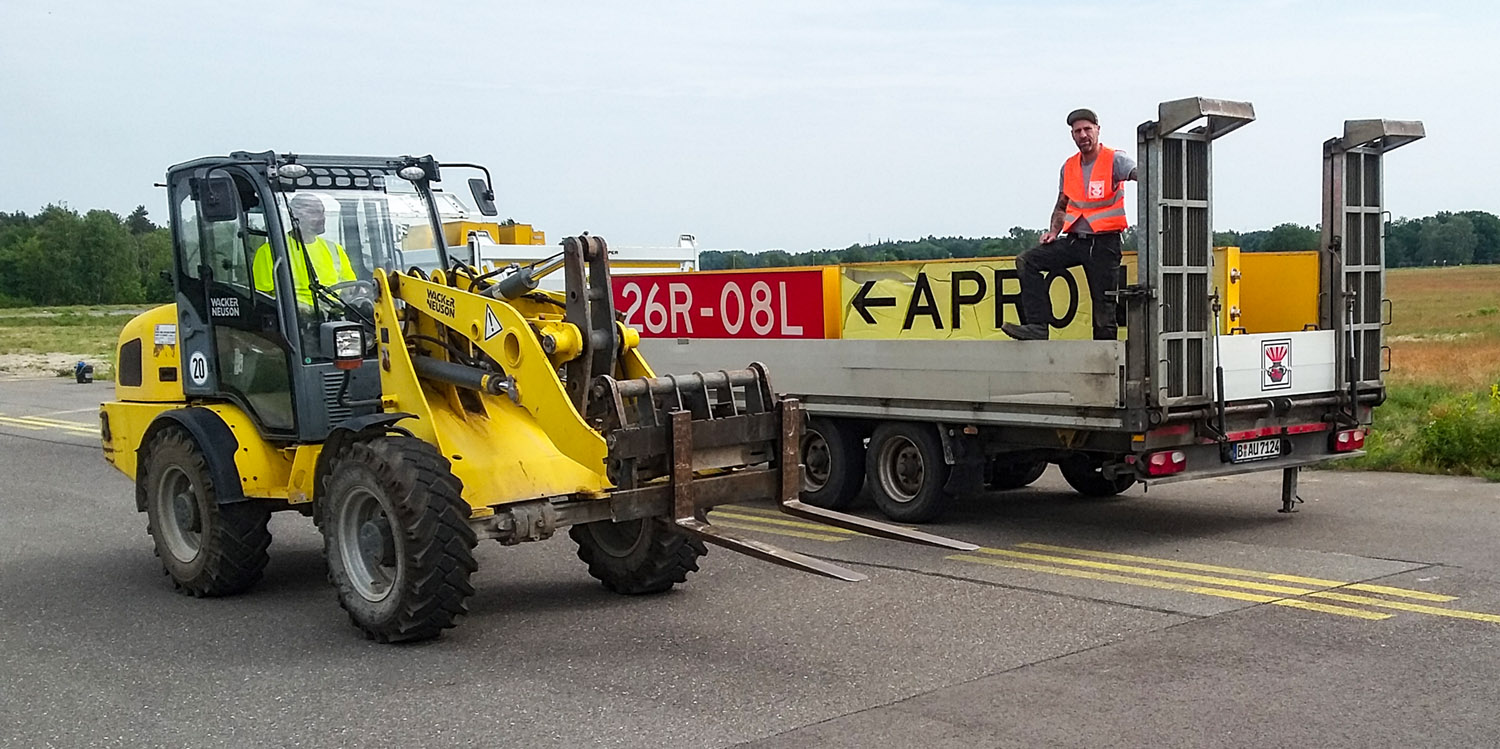 Ohne sein Schild wäre er vorne über gekippt, vorsichtig die Zange angehoben und mit dem Lkw druntergefahren.