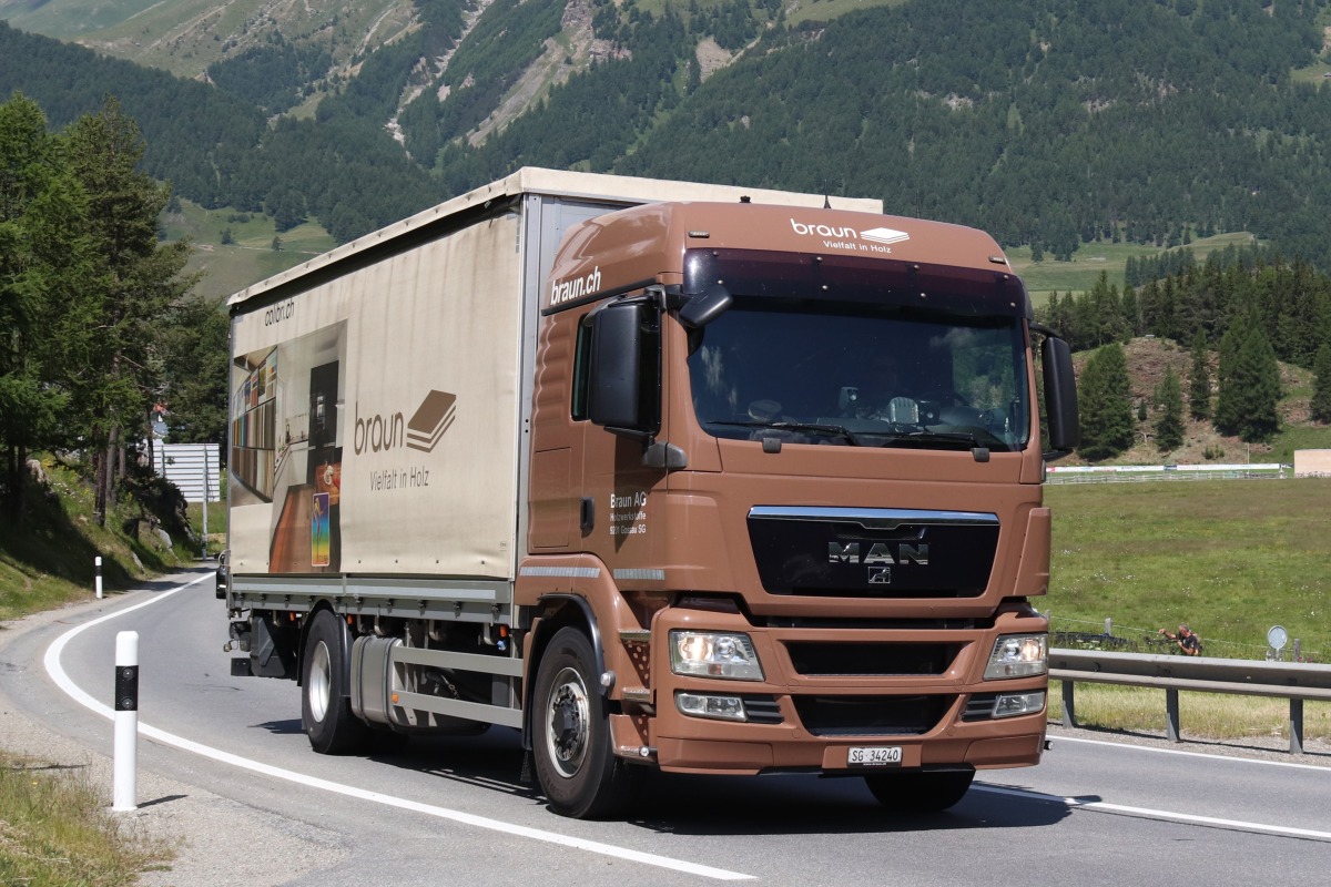 MAN TGS von Braun AG Holzwerkstoffe unterwegs im Engadin.