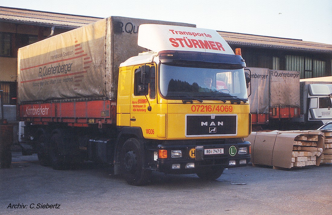 nach den schönen noch existierenden Fahrzeugen, hier ein damals aktiver MAN F90 6x2 des ehemaligen Transportunternehmen Manfred Stürmer aus Helfenberg im Bezirk Rohrbach in Oberösterreich.