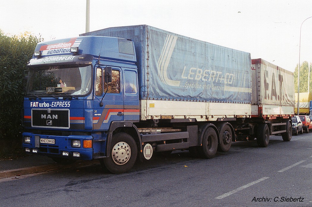 im März 1995 war dieser MAN F90 26.422 für die 1939 gegründete Spedition Schäflein mit Hauptsitz im Unterfränkischen Röthlein unterwegs. Zum Zeitpunkt der Aufnahme hatte Schäflein noch eine Niederlassung im saarländischen St. Wendel und war von dort als F.A.T.-Partner regelmäßig im Frankreichverkehr im Einsatz.