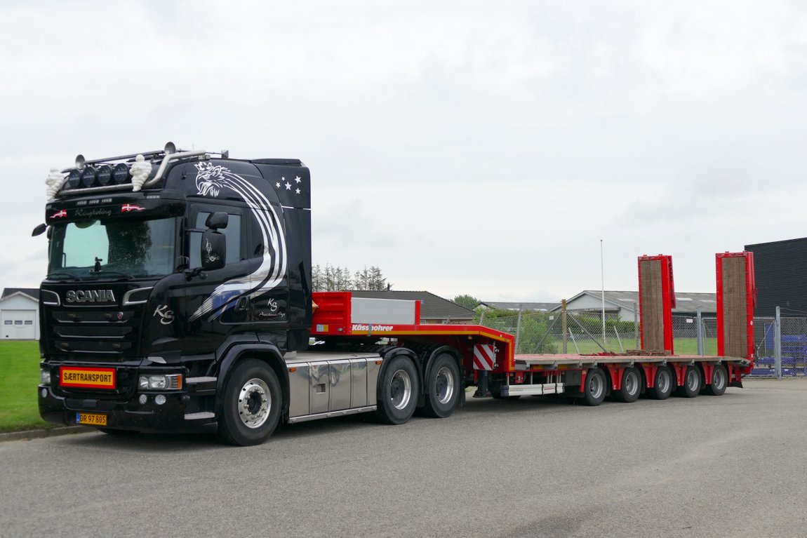 Scania R730 von "KS Assistance" aus Rinkøbing mit Kässbohrer Tieflader