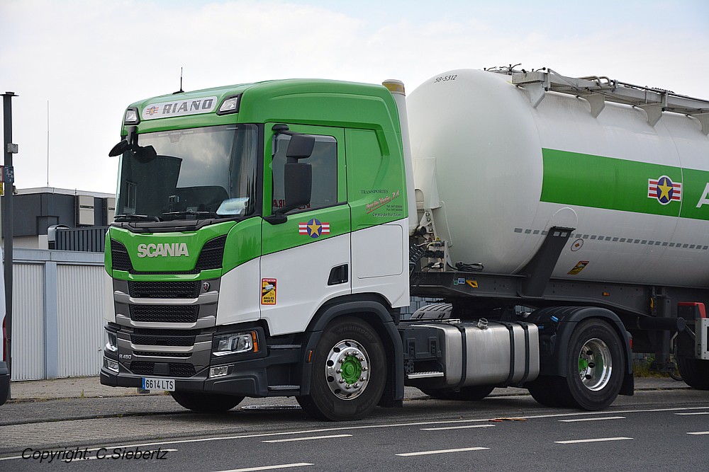 nach dem von Henning gezeigten TGX von Agustin Riano Transportes, hier ein weiteres Exemplar in Form eines Scania R 450 mit Feldbinder Siloauflieger.