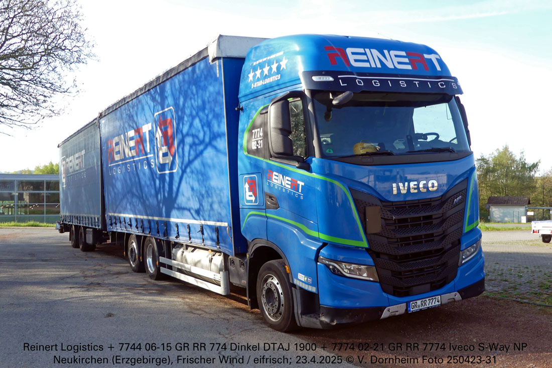 Reinert Logistics 7774 02-21 GR RR 7774 Iveco S-Way NP + 7744 06-15 GR RR 774 Dinkel DTAJ 1900 + ST 165 Moffett M4 am Morgen des 23.4.2025 neben Eifrisch in Neukirchen (Erzgebirge).