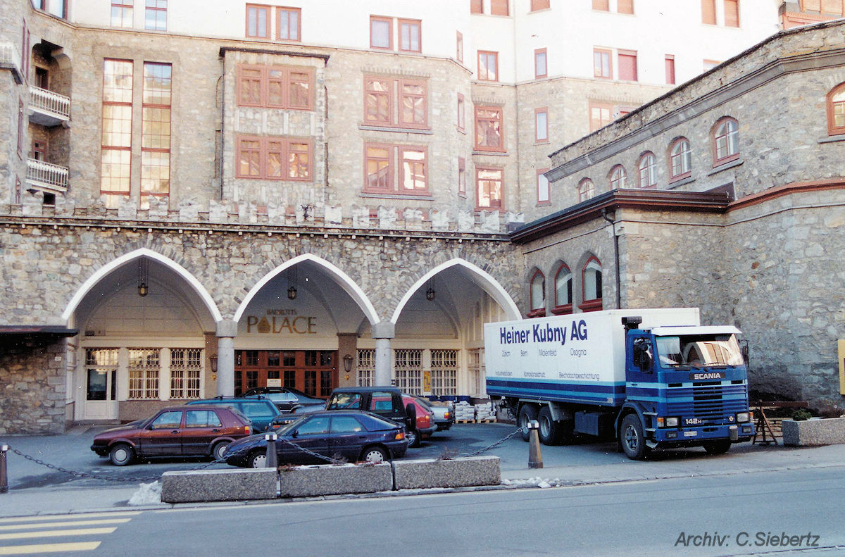 vor dem Eingang zum Badrutt's Palace Hotel in St. Moritz, stand zum Aufnahmezeitpunkt dieser dreiachsige Scania R 142 H mit eher selten anzutreffender Nahverkehrskabine und Kofferaufbau.