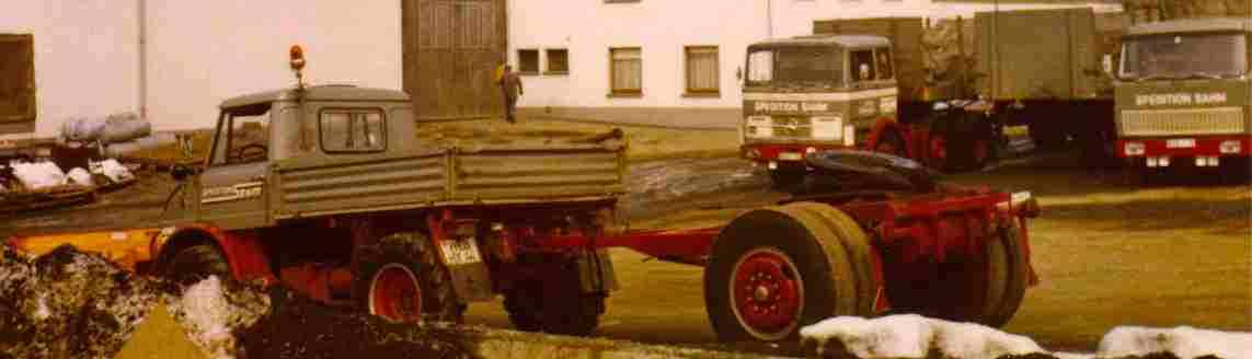 der Unimog mit dem Kreissägeanbau dürfte ein U1200/1400 sein, mittelschwere Baureihe. Der Zugunimog des Hackers ist ein U1800/2100/2400, erkennbar an den tief angebauten Blinkern am vorderen Fahrerhauseck.