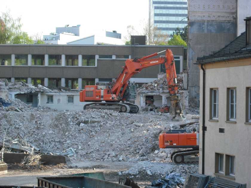 Bild 6 u. 7: hier wurde schon ganze arbeit geleistet. auf meinem letzten bild war noch der kleine Minibagger auf dem Dach des Gebäudes unterwegs, das jetzt hier als häufchen liegt.