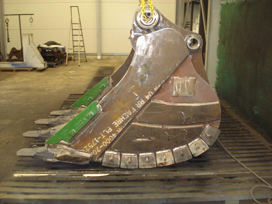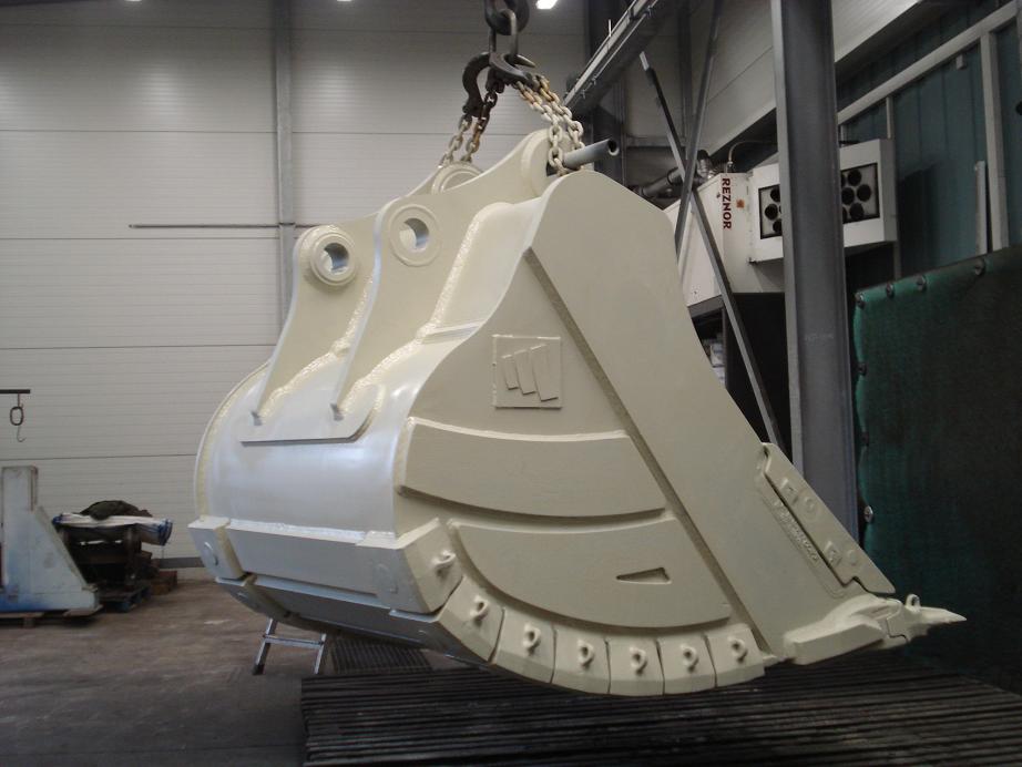 der Löffel ist für einen 80 Tonner. Geht in einen Kalksteinbruch, deshalb keine Rippen auf der Innenseite.