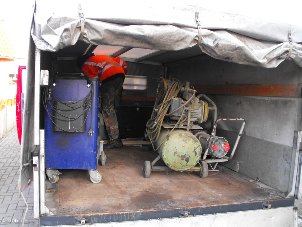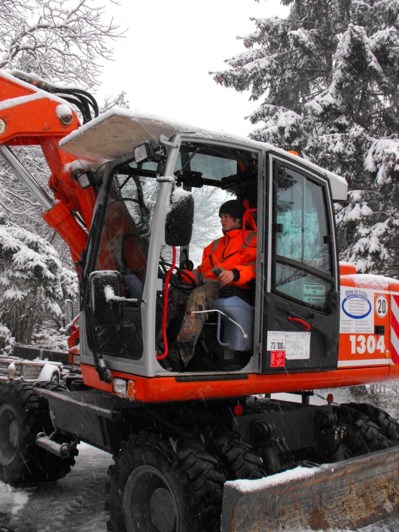 9.00 Uhr Dario starte den Atlas 1304 und lässt ihn warmlaufen. Er macht sich mit dem Bagger auf dem Weg nach Alswede. Kurze Zeit später starte Ralf mit dem 814 und Tandemtieflader. Phil welcher aus Speyer kommt unter stüzt uns heute. Ich mache mich mit ihm auch auf den Weg nach Alswede. Wir fahren wieder mit dem voll gepackten Sprinter. Auf dem hinweg kamen wir immer mehr ins Schneegestöber. Aber die trübte unsere Stimmung nur wenig auch wenn wir alle wussten das uns das Wetter nicht grade hilfreich sein wird. In Alswede angekommen ging alles ganz schnell. Den fahrbaren Kompressor abladen due Radmuttern öffnen und aus einer 8fach Bereifung mal eben eine 4fach machen. Sonst hätte er nicht auf den Tandem gepasst. Dies ging alles besser als wir erwarteten. Aber so langsam macht uns der Schnee doch sorgen es Schneit immer heftiger. Aber wer alte Bagger rettet den stört das wenig. Also weiter im Plan. Dario positioniert sich mit dem 1304 in der engen Hofeinfahrt wo der Weserwolff steht. So dann einfach eine Kette an den Unterwagen des Weserwolffes und mal ziehen. Der Weserwolff bewegt sich ohne probleme. Der 1304 lässt dich von der Last auch nichts anmerken auch wenn er etwas auf der verschneiten Strasse rutscht. Phil stieg entschlossen in den Weserwolff und versuchte den Bagger zu lenken. Aber es geschah nichts auch die Lenkung war total festgegammelt. Und das geschah es. Ein lauter Knall vorne Links platzte das Rad. Also wieder alls ausräumen und vorne eine anderes Rad drauf. Zum Glück hatte der gute Herr dem der Bagger gehörte noch eins liegen. Nachdem der Bagger dann ohne weitere Probleme auf der Straße stand hingen wir den Gittermasten ein und machten das Seil vom Ausleger los. Dario senkte ihn dann ganz feinfühlig mit dem 1304 ab. So als nächstes steht Ausleger abbauen auf dem plan. Sicherungsblech lösen und dann mal mit dem Vorschlaghammer einfach drauf kloppen und siehe da der Bolzen kam ohne Probleme. Einmal dick Rostlöser drauf sprühen den Bolzen ein paar mal hin und her kloppen und dann komplett raus. So der Ausleger ist dann auch abgebaut. Inzwischen haben wir schon nach 13Uhr, also erstmal alle in den warmen Sprinter und Mittagessen bei den Leuten mit dem großen gelben M.
