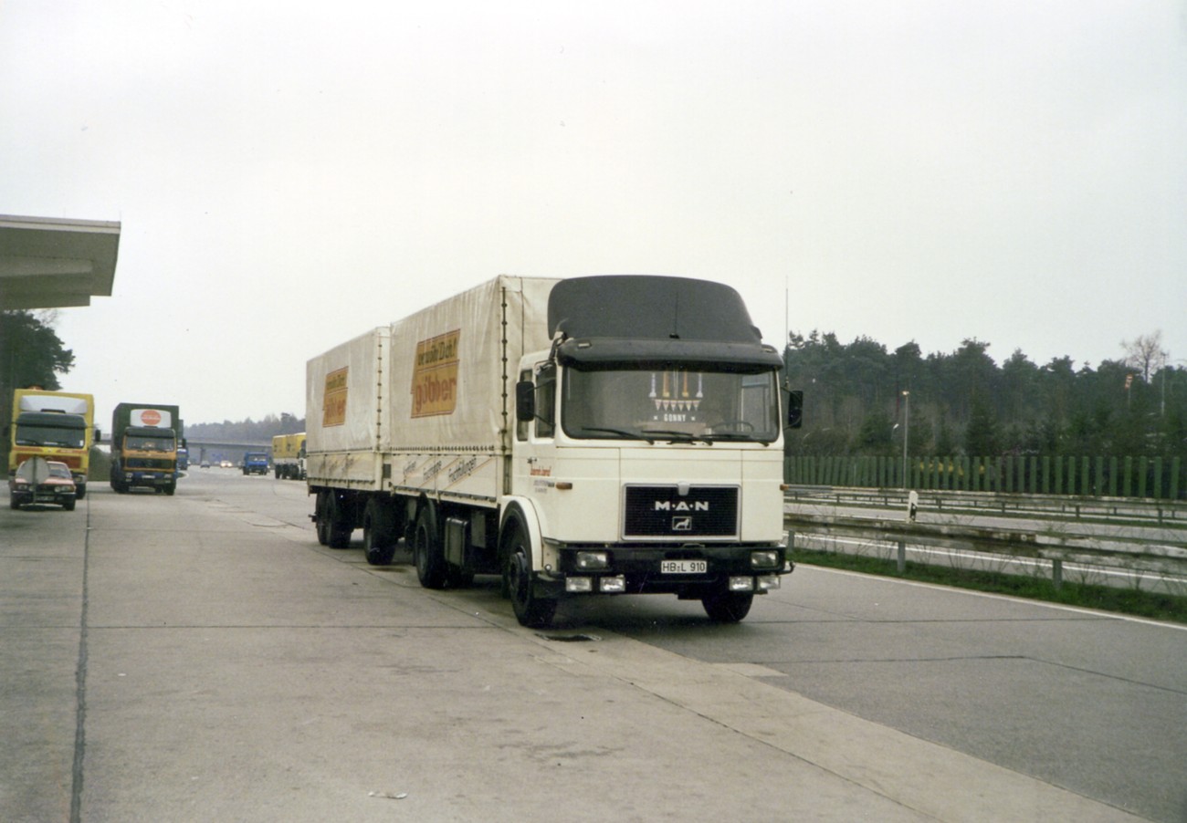 2. M.A.N F8 Hängerzug eines Bremer Spediteurs unterwegs mit Göbber Marmelade, fofografiert 1988 am Rastplatz Hockenheim