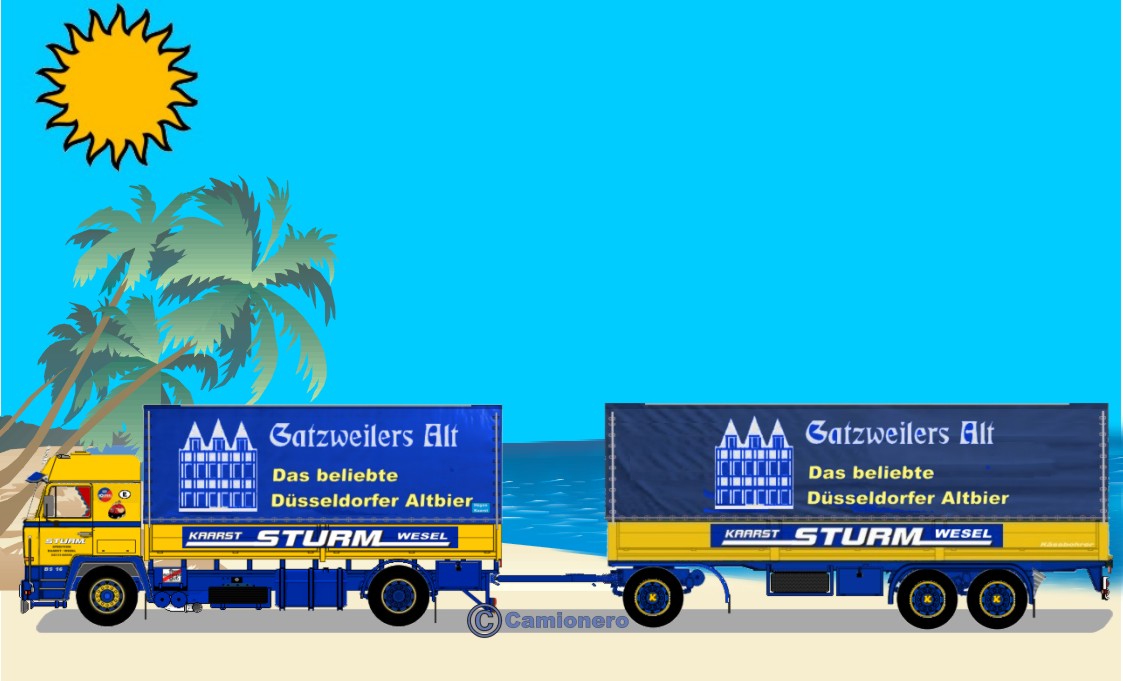 Hier mal einen Büssing von Sturm, sowas fuhr man dort als ich da angefangen habe. Die hatten damals 2 mit Büssing und Sohn Fahrerhaus, einen mit 240 PS und einen mit 320 PS. Dann noch einen "normalen" BS16 mit 320 PS, einen DB 1624 mit Kroatzbeere Beschriftung, einen DB 1624 Wackenhut mit König-Pilsner in silber. Später kam der erste 111er Scania u.s.w. Waren schöne aber auch wilde Zeiten damals dort, erinnere mich gerne daran.