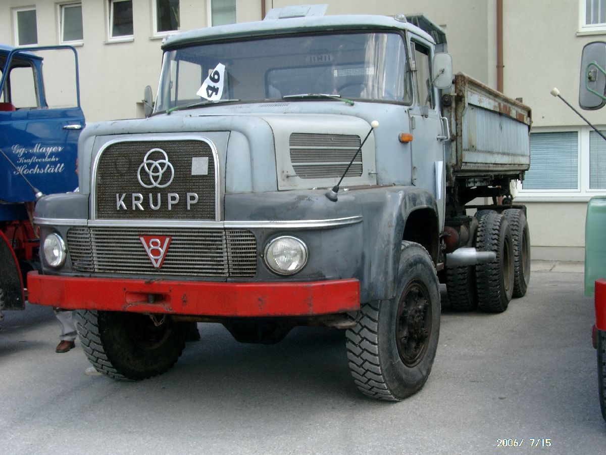 Das ist ein sehr schönes Foto eines Krupp KF 380 (K=Kipper, F=Frontlenker, 3= Dreiachser, 80=8-Zylinder-Cummins-V-Motor). Ich freue mich immer über Fotos von Krupp-LKWs.