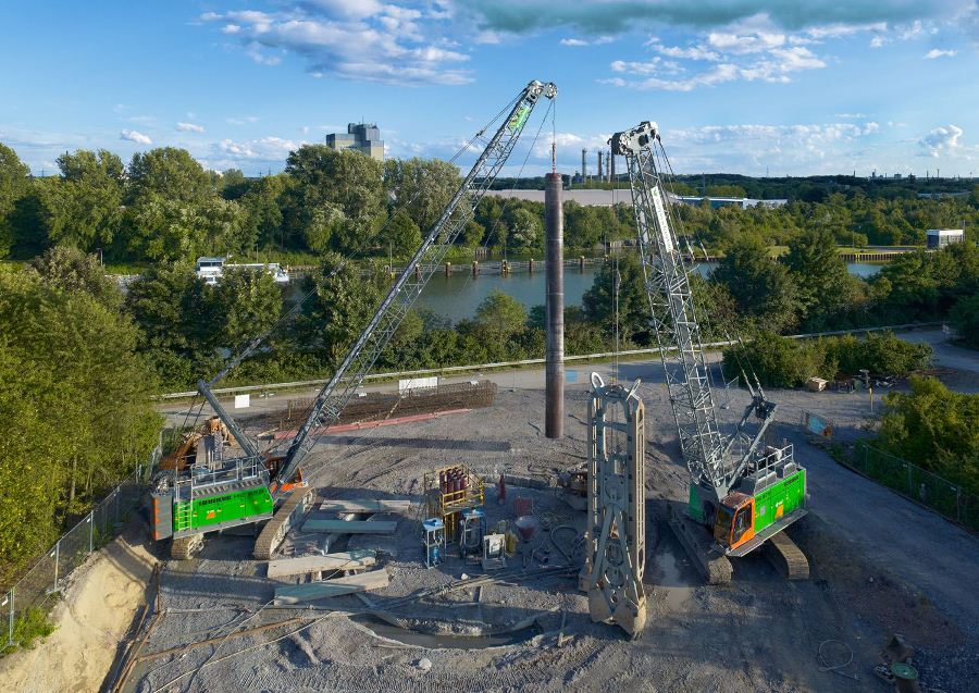 HS 875 mit Stein- Greifer und HS 855 als Service Kran von Wayss und Freytag beim Schlitzen im Rohrgebiet