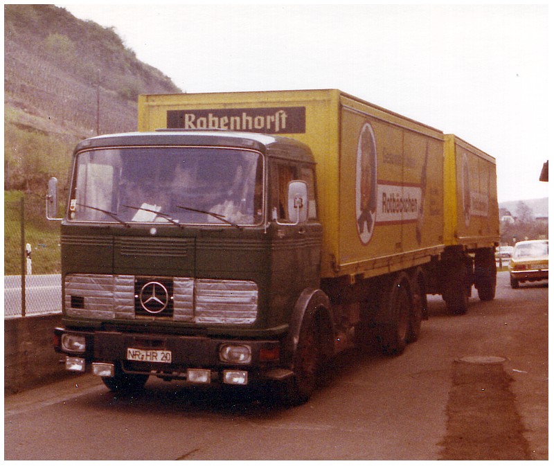 Es handelt sich dabei um den auch hier schon mehrfach gezeigten Mercedes-Benz LP 2232 mit Ackermann Wechselkoffersystem der Rabenhorst Fruchtsäfte aus Unkel am Rhein.